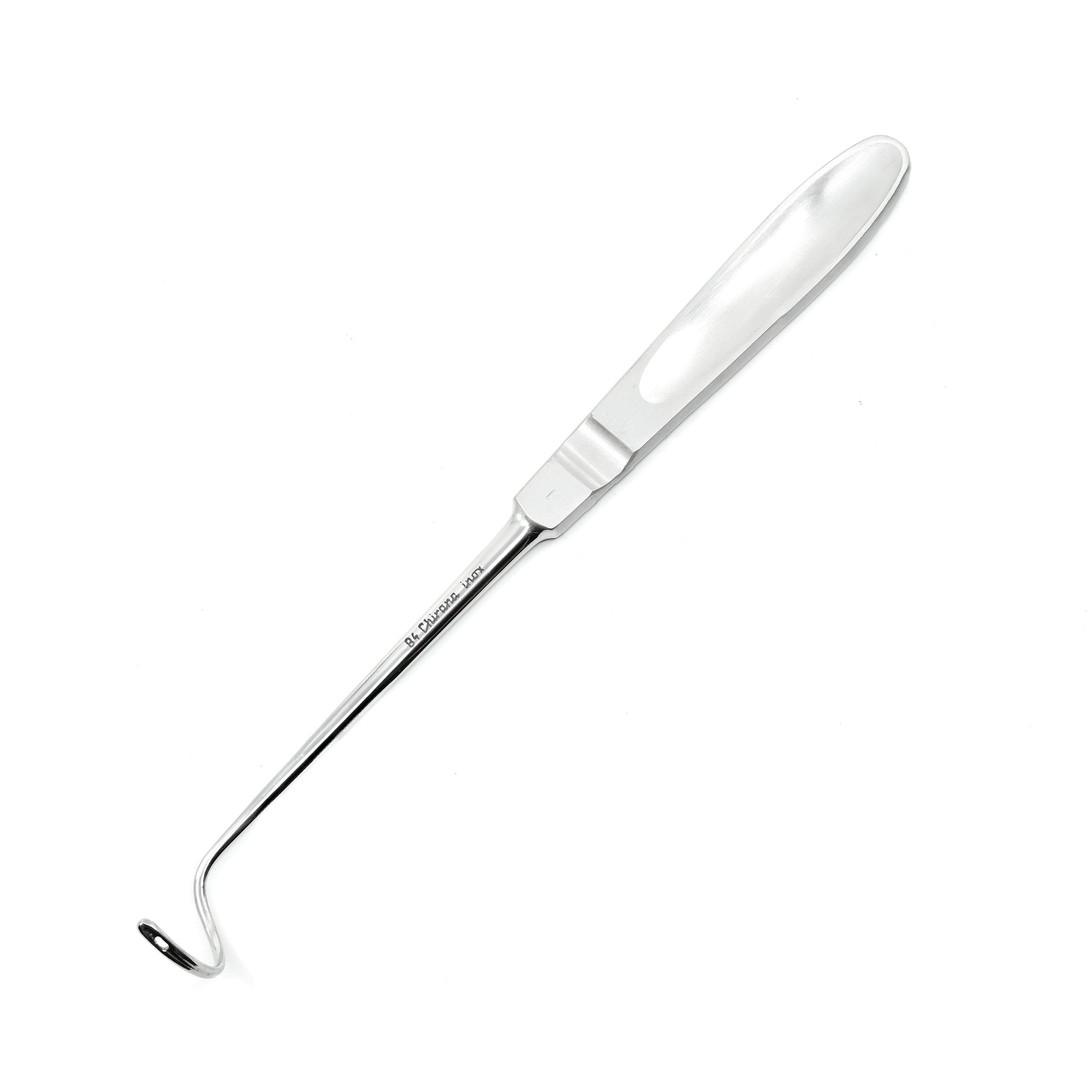 L'aiguille Deschamps permet d'enfiler des fils chirurgicaux dans des endroits difficiles d'accès (par exemple autour d'un vaisseau) et de les nouer. Sa longueur totale est de 22 cm. Acier chirurgical de haute qualité du fabricant CHIRANA. Aiguille émoussée courbée vers la droite. L'instrument est destiné à un usage répété et à la stérilisation. Il s'agit d'un matériel stocké depuis 60 ans.