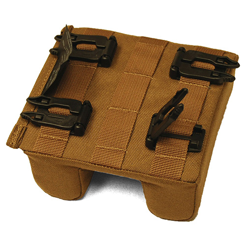 Support de tir pour soutenir l'arme lors de tirs à longue distance. Peut être fixé à des sacs à dos ou à d'autres plateformes avec une fixation PALS/MOLLE à l'aide de quatre boucles en plastique pouvant être rapidement détachées et déplacées. Une fois entièrement fixé, il occupe trois colonnes x trois rangées de sangles. Sa forme avec une rainure au milieu permet de bien fixer la crosse de l'arme. Rembourrage léger en mousse.