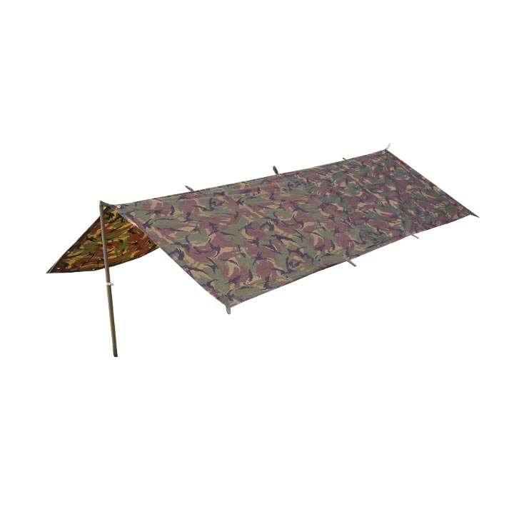 Abri polyvalent. Pour les situations où un abri d'urgence, un refuge ou un abri temporaire est nécessaire. Douze boucles renforcées sur les bords. Œillets en laiton sur les bords et au centre. Matériau : nylon avec revêtement PU. Dimensions : 255 x 172 cm, poids : 1,4 kg. Les piquets ne sont pas inclus.