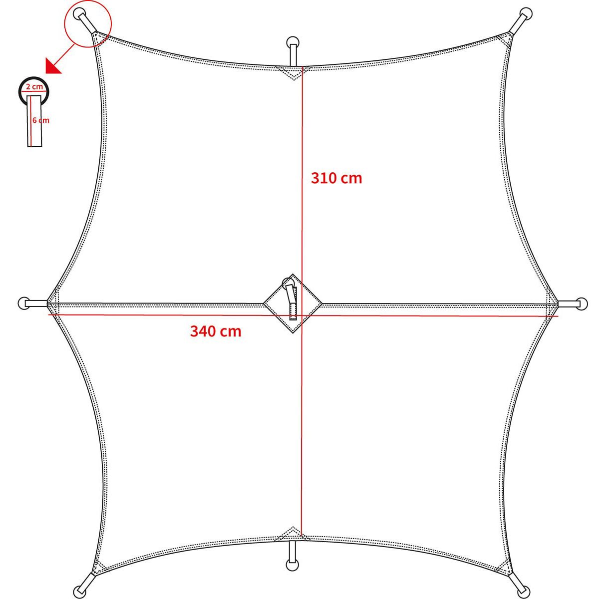 Grâce à sa forme HEXAGONALE spéciale et à sa taille, il est particulièrement adapté aux hamacs ou à une utilisation comme bâche de tente, imperméable ou pare-soleil. Au total, 9 boucles avec anneaux métalliques, y compris 8 piquets et 8 cordes d'ancrage.