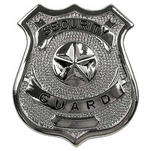 Insigne métallique argenté portant l'inscription SECURITY GUARD.