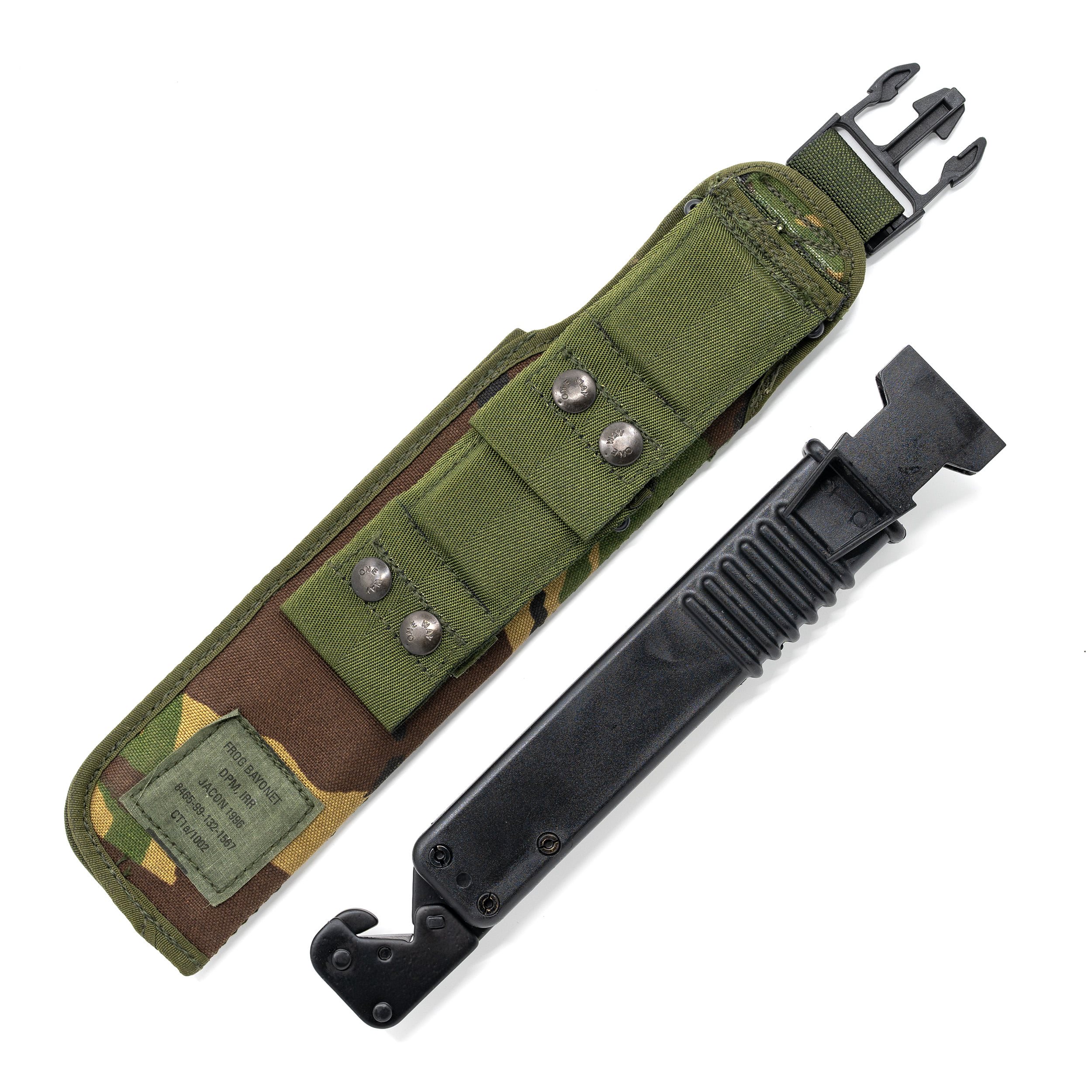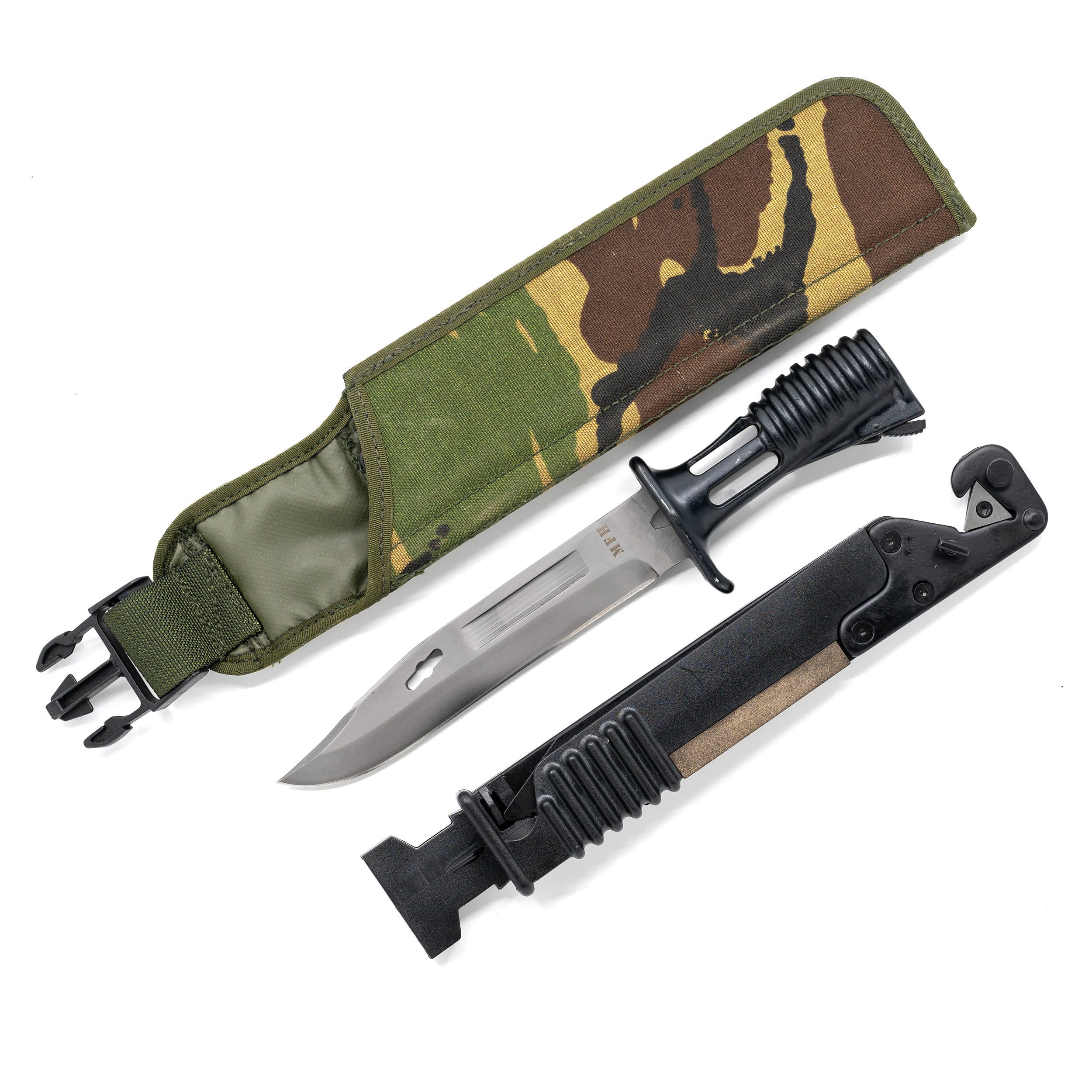 Reproduction d'une baïonnette britannique de type SA80. Livrée avec un étui en tissu doté d'un insert rigide contenant une scie pliante d'environ 17 cm, un fusil à aiguiser et un tenon à insérer dans l'ouverture de la baïonnette. Ensemble, ces éléments peuvent servir de pince.