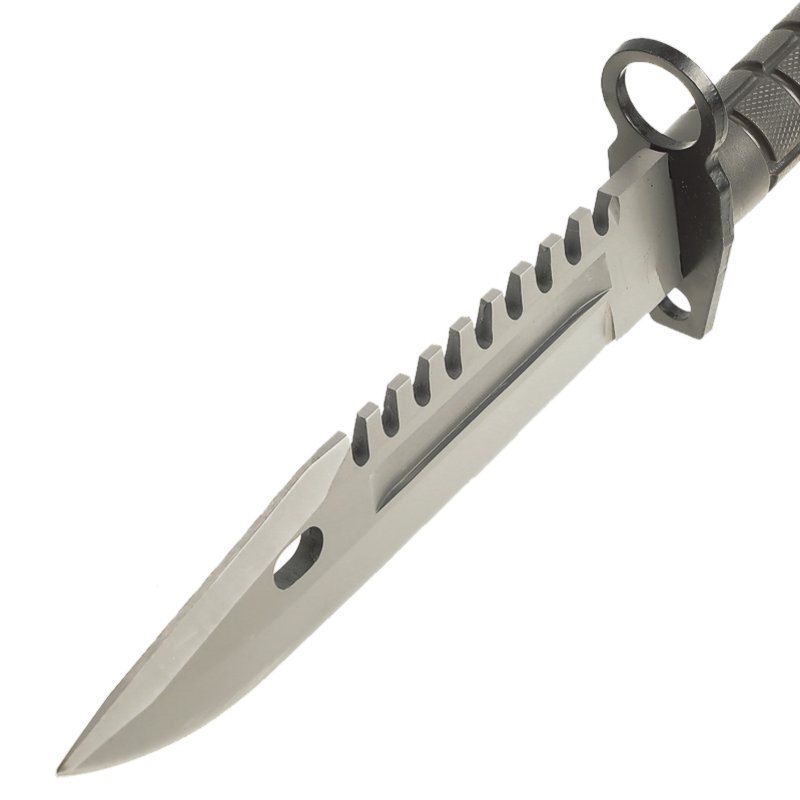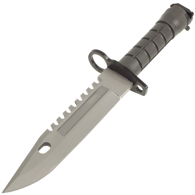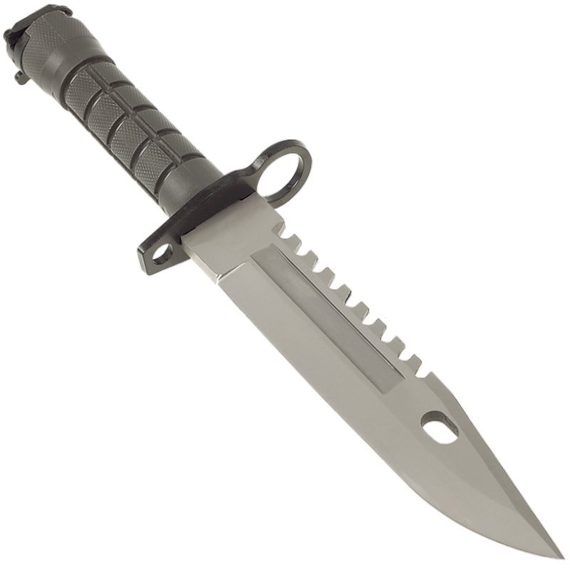 Baïonnette robuste fabriquée d'après un modèle classique, qui est entré en service dans l'armée américaine en 1986. Tout comme le modèle original, ce couteau présente une construction robuste adaptée à toute une série de tâches. La lame à tranchant lisse est fabriquée en acier inoxydable 420 résistant, et son dos est doté d’une scie, tandis que la partie avant comporte un trou servant, en combinaison avec l’étui, à couper des fils métalliques. La garde métallique du couteau sert non seulement à fixer le couteau sur le fusil d'assaut, mais aussi à protéger la main pendant le travail. La poignée est fabriquée en plastique durci avec une texture antidérapante assurant une prise ferme dans toutes les conditions. Le couteau est livré avec un étui de ceinture robuste muni d'une boucle en plastique solide.