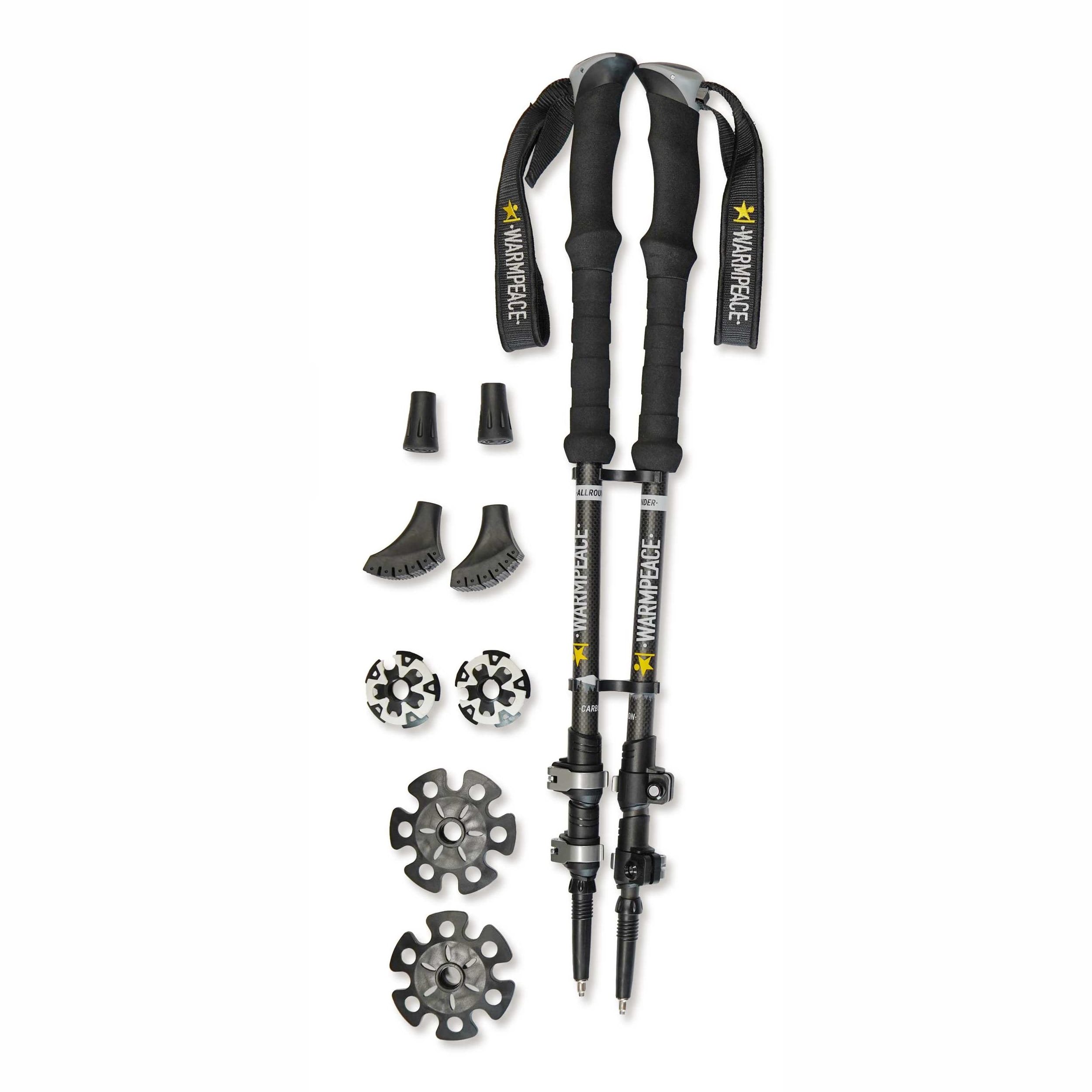 Bâtons de randonnée télescopiques (réglables en longueur) en carbone, avec accessoires supplémentaires : rondelles interchangeables, raccords en plastique, embouts.