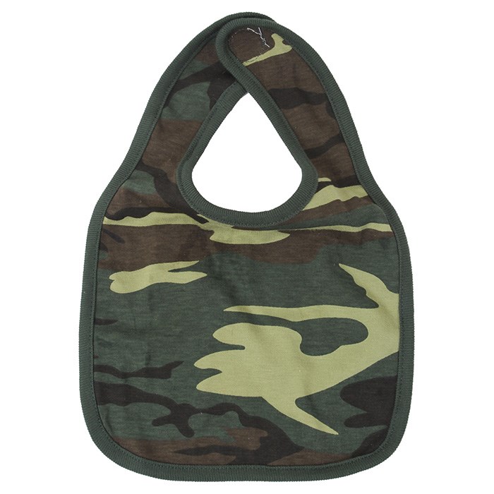 Bavoir pour bébé de style militaire avec motif camouflage Woodland. Fermeture à velcro. Composition : 100 % coton.