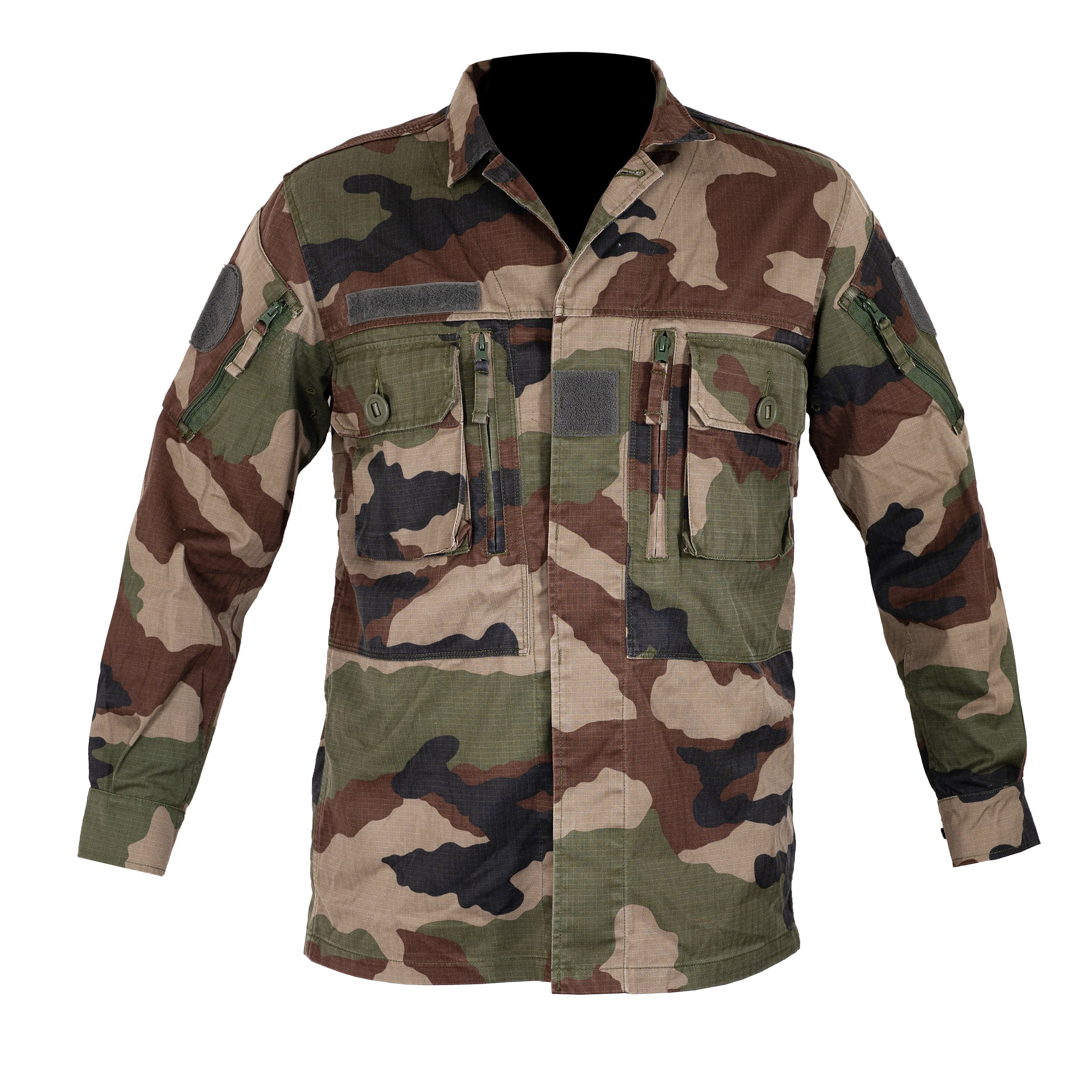 Blouse provenant des stocks de l'armée française. Poches à boutons sur la poitrine, poches à fermeture éclair verticale en dessous, poches sur les manches, bandes velcro pour écussons. Composition : 67 % coton, 33 % polyester. Plus d'informations