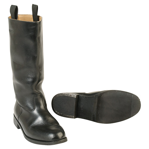 Bottes d'occasion de l'armée allemande. Bottes en cuir imperméables WACHBATAILLON. Matériau extérieur : cuir noir lisse et imperméable. Plus d'informations