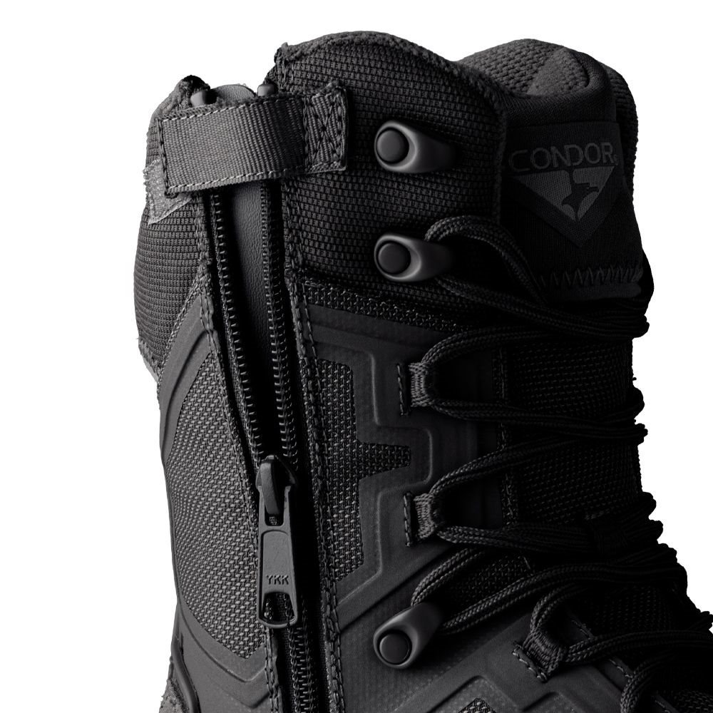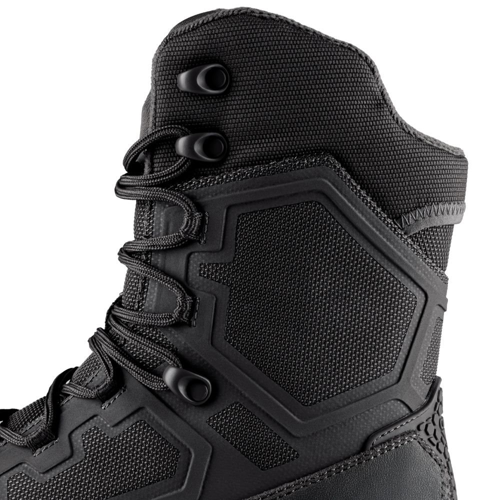 La fermeture éclair YKK latérale permet d'enfiler et de retirer la chaussure très rapidement ; elle est dotée d'une boucle de sécurité dans sa partie supérieure. Le système de laçage est compatible avec les détecteurs de métaux et répond aux exigences de la TSA. La languette est reliée à la chaussure de manière à empêcher toute pénétration indésirable de saletés et dispose d'un compartiment intégré pour ranger les lacets. L'un des principaux atouts de cette chaussure est le système TacFit Technology® qui permet un réglage variable de la largeur intérieure à l'aide de la semelle intérieure fournie. La semelle intérieure PerfX® est fabriquée à partir de 30 % de matériaux recyclés et offre un haut niveau de confort.
