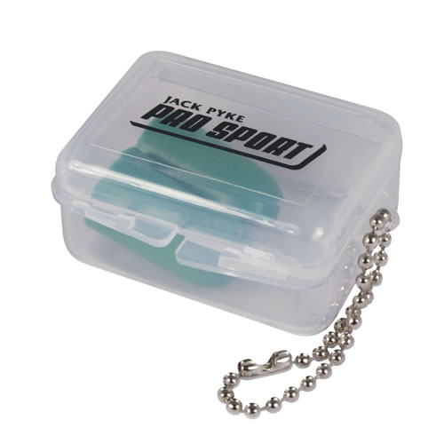 Une paire de bouchons d'oreille en mousse, livrée dans une boîte avec une chaîne. Différentes couleurs disponibles. Plus d'informations