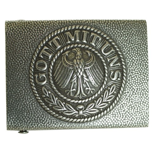 Boucle métallique patinée avec l'inscription « GOTT MITT UNS » et l'aigle BW pour ceinture en cuir de 45 mm de large. Fermeture à crochet. Double tige pour fixation à une ceinture en cuir avec un écartement de 18 mm.