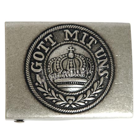 Boucle métallique avec inscription « GOTT MITT UNS » pour ceinture en cuir de 45 mm de large. Fermeture à crochet. Double tige pour fixation à une ceinture en cuir avec un espacement de 18 mm.