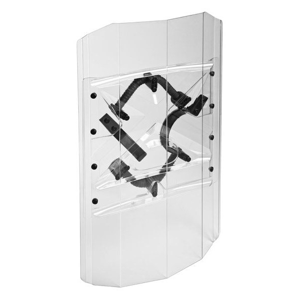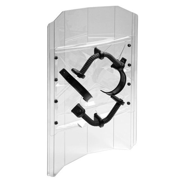 Dimensions : largeur 570 x hauteur 1000 mm dans la version de base, poids 4,25 kg. La largeur peut être ajustée à 550 mm, la hauteur peut être ajustée selon les besoins. Un polycarbonate de haute qualité et extrêmement résistant d'une épaisseur de 3 mm est utilisé (peut être modifié jusqu'à 5 mm sur demande). La plaque de renfort interne de forme ergonomique amortit efficacement les chocs et la transmission des vibrations à la main qui tient le manche. Les poignées permettent une prise en main par la main droite ou gauche et une prise d'appoint par la main libre. La forme effilée du bouclier dévie efficacement les coups sur les côtés. En ajoutant des articles à votre panier, vous certifiez être âgé de plus de 18 ans.
