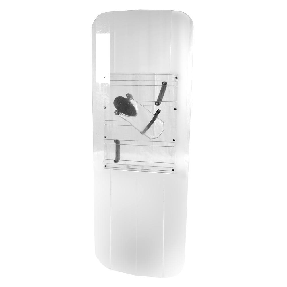 Polycarbonate d'une épaisseur de 3 mm. La plaque de renfort ergonomique interne amortit efficacement les chocs et la transmission des vibrations à la main qui tient le bouclier. La poignée est double et permet de tenir le bouclier à deux mains. La forme effilée du bouclier dévie efficacement les coups sur les côtés.
