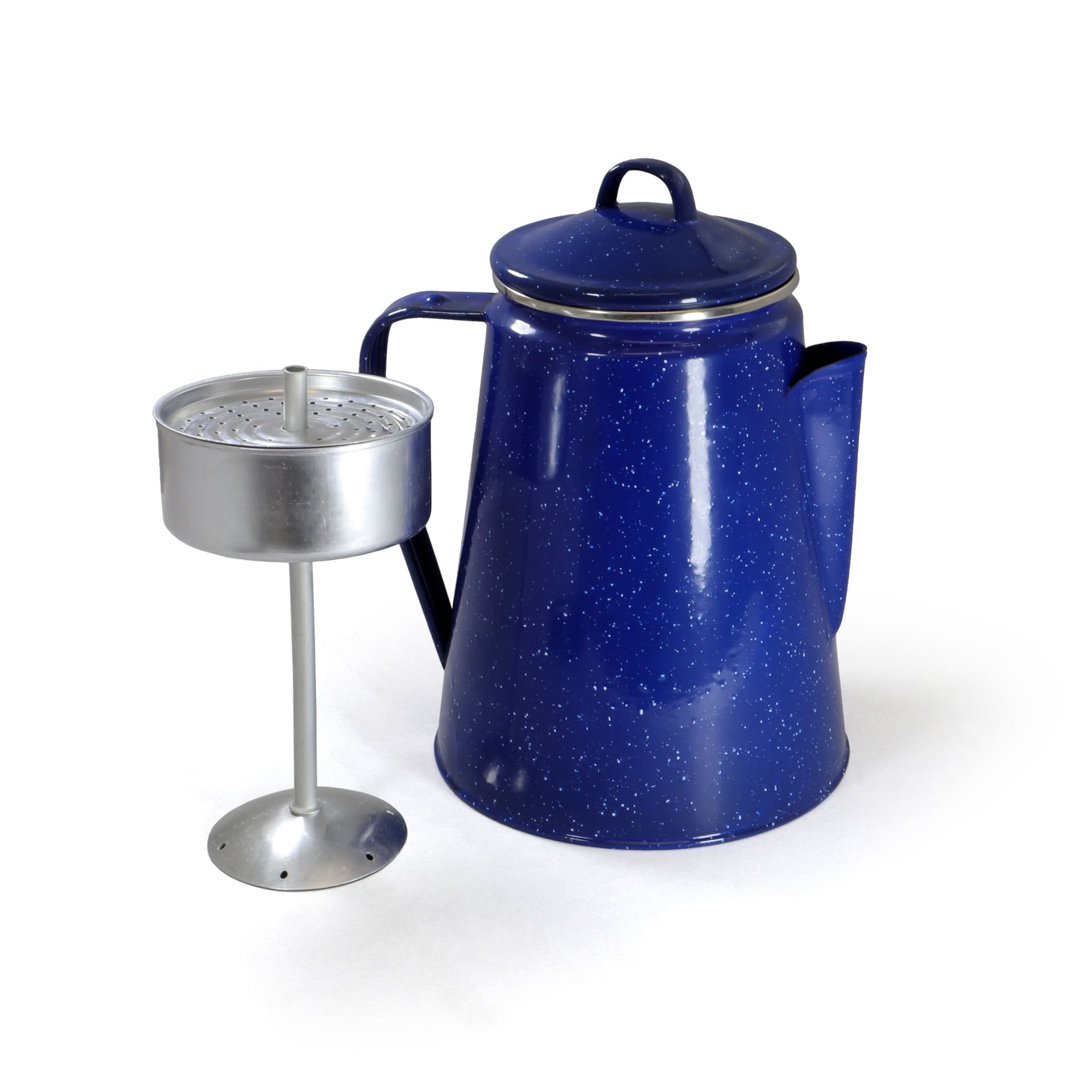 Bouilloire émaillée de deux litres, comprenant un percolateur amovible et un couvercle. Le percolateur sert à filtrer le café (détails ci-dessous). La bouilloire est équipée d'une poignée. Capacité : 1,8 litre.