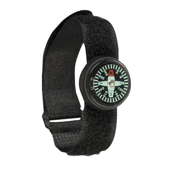 Petite boussole simple, conçue pour être fixée au bracelet de montre (fournie avec son propre bracelet à velcro). Résistante aux chocs et à l'eau (protégée par du caoutchouc), cadran luminescent.