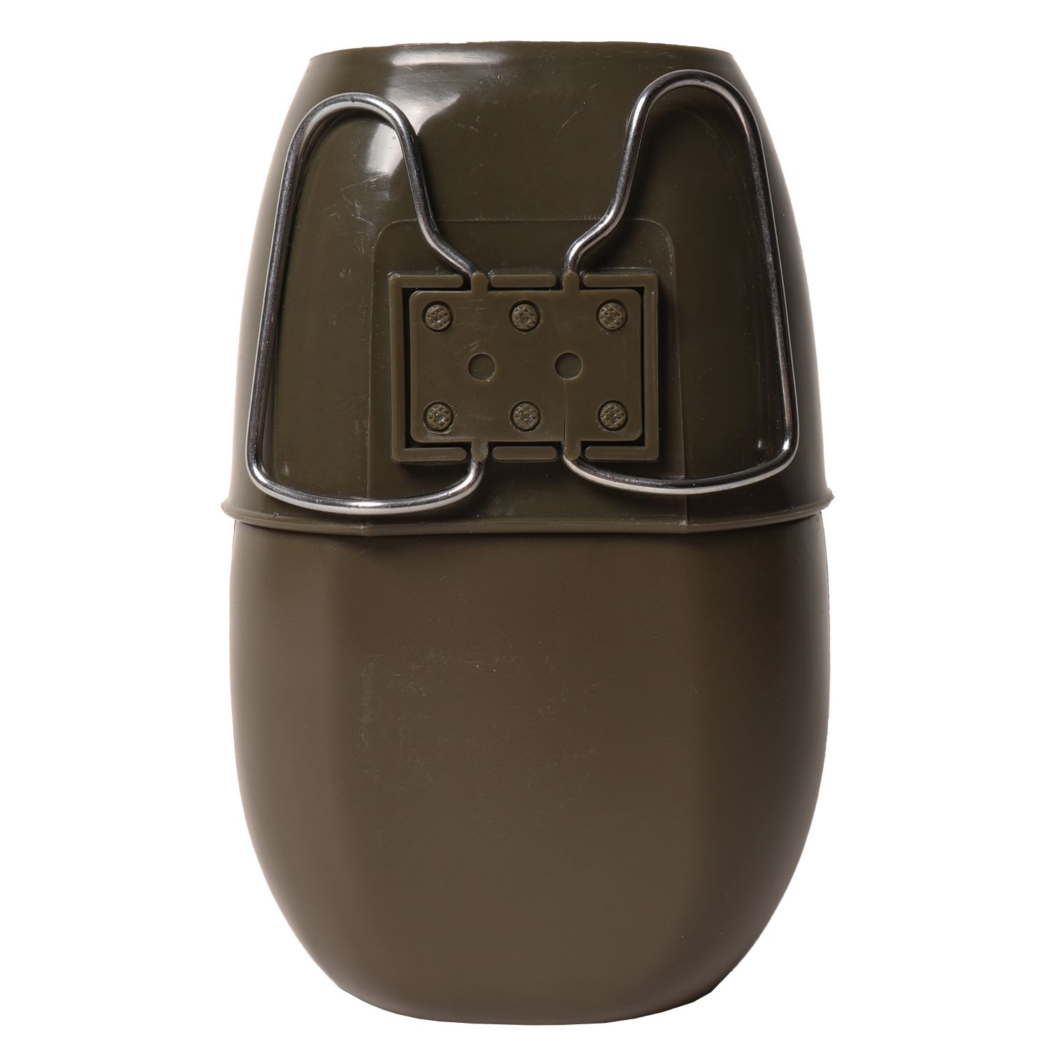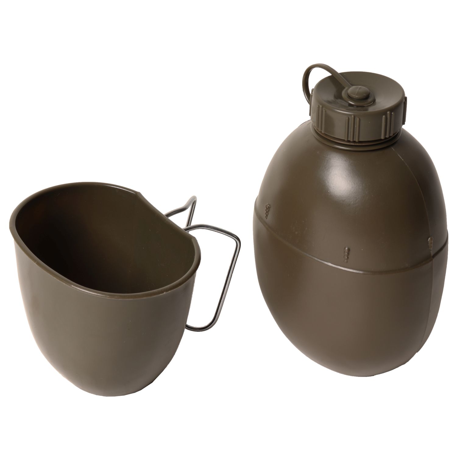 Bouteille verte avec bec, du même type que celle utilisée par l'armée britannique. Bec avec poignées métalliques pliables, s'adaptant à la partie supérieure de la bouteille. Matériau : plastique. Contenance : environ 1 000 ml. Produit d'occasion. Plus d'informations