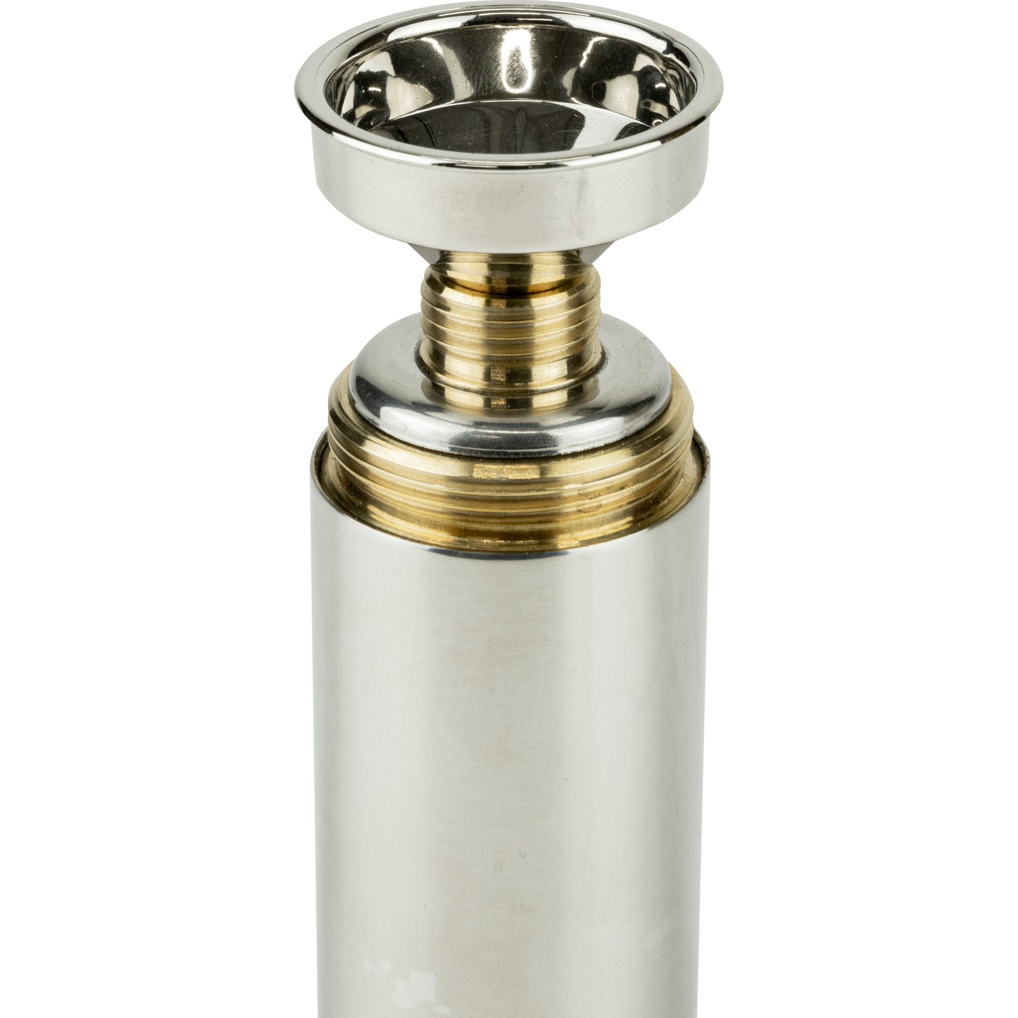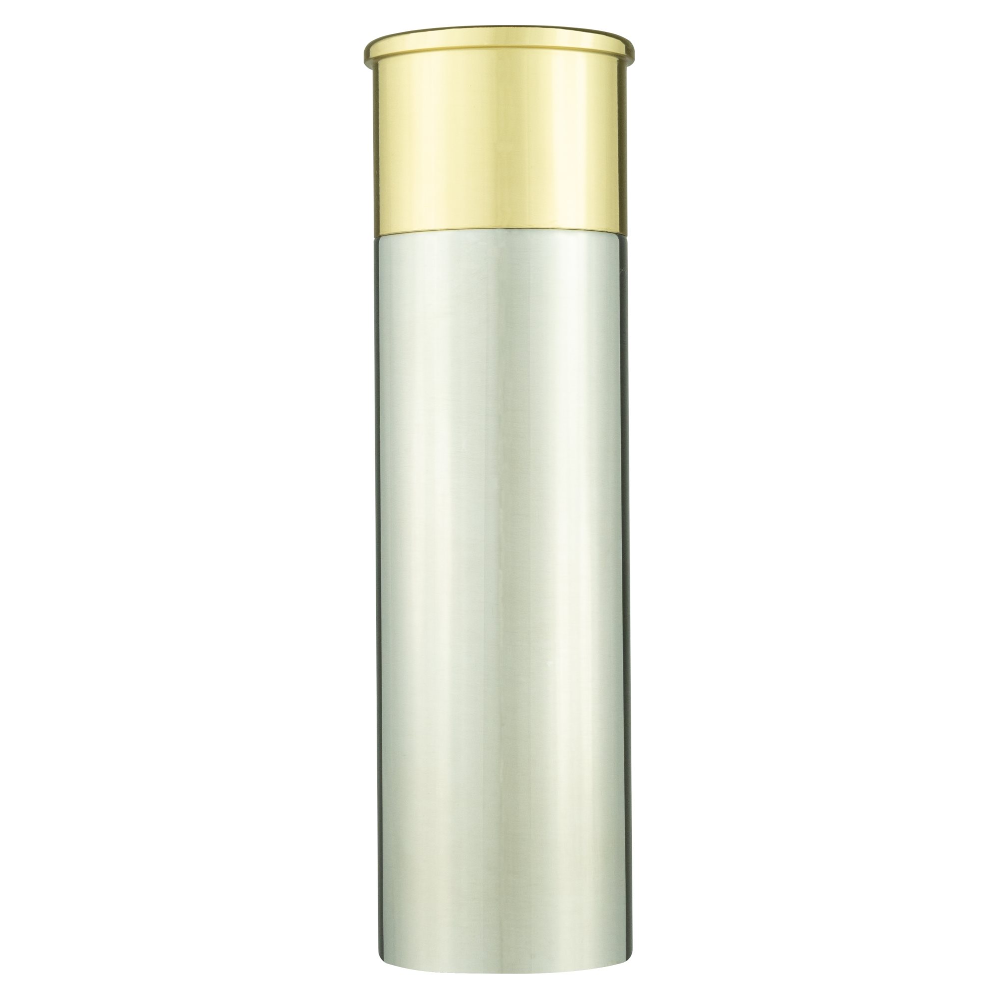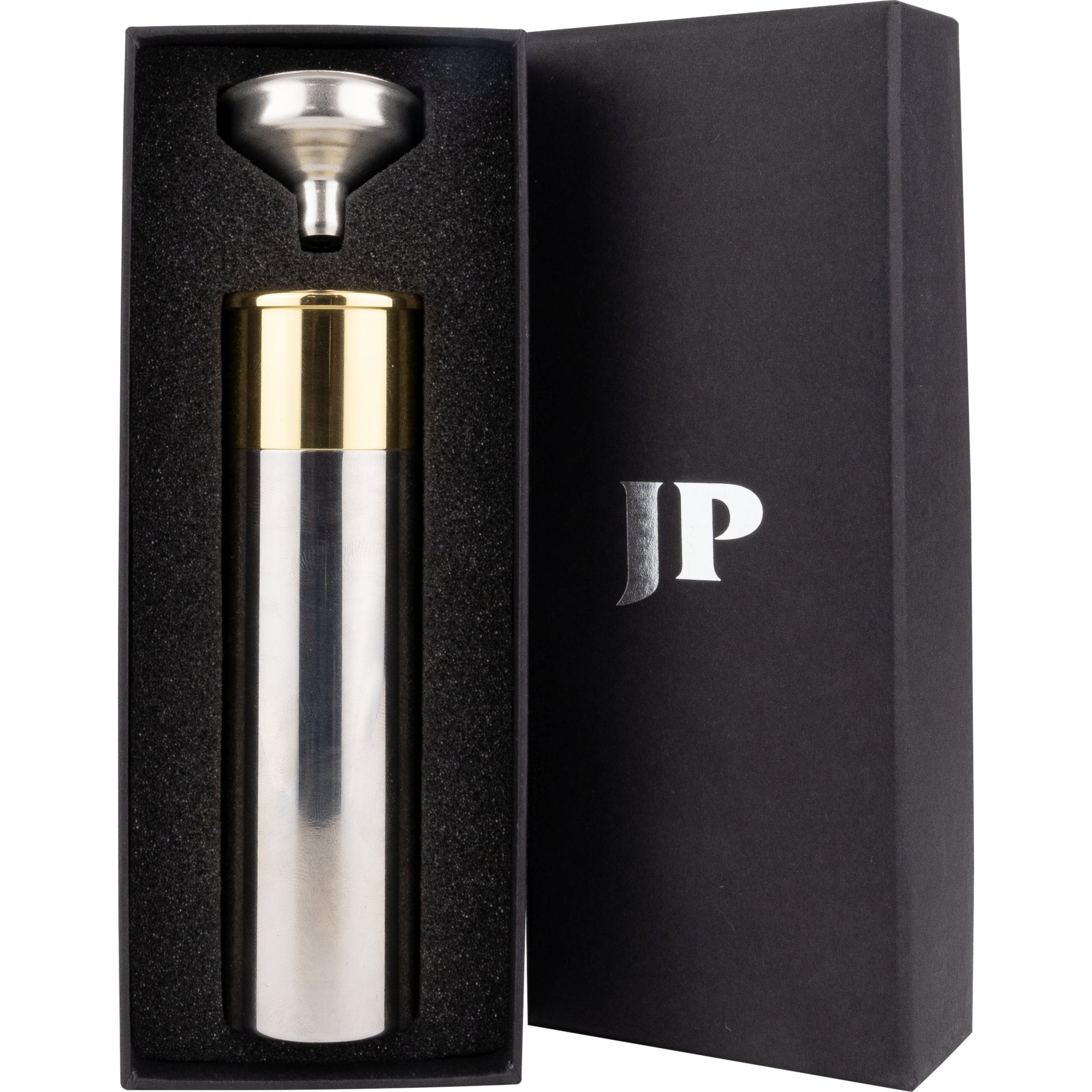 Petite bouteille élégante pour une boisson réconfortante, de très haute qualité. Partagez avec vos amis ou collègues un verre de whisky, de rhum, de slivovitz, etc., où que vous alliez. La bouteille a la forme d'une cartouche, avec un corps argenté et un bouchon à vis doré, également très brillant. La boisson est sécurisée dans la bouteille par un autre bouchon à vis plus petit. Pour faciliter le remplissage, un entonnoir en acier inoxydable est inclus dans l'emballage.