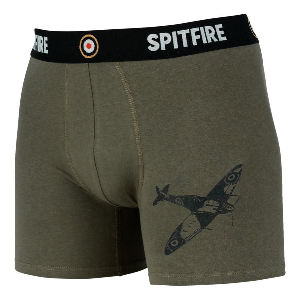 Boxers verts avec taille élastique souple, inscription SPITFIRE et illustration d'avion sur la cuisse gauche. Plus d'informations