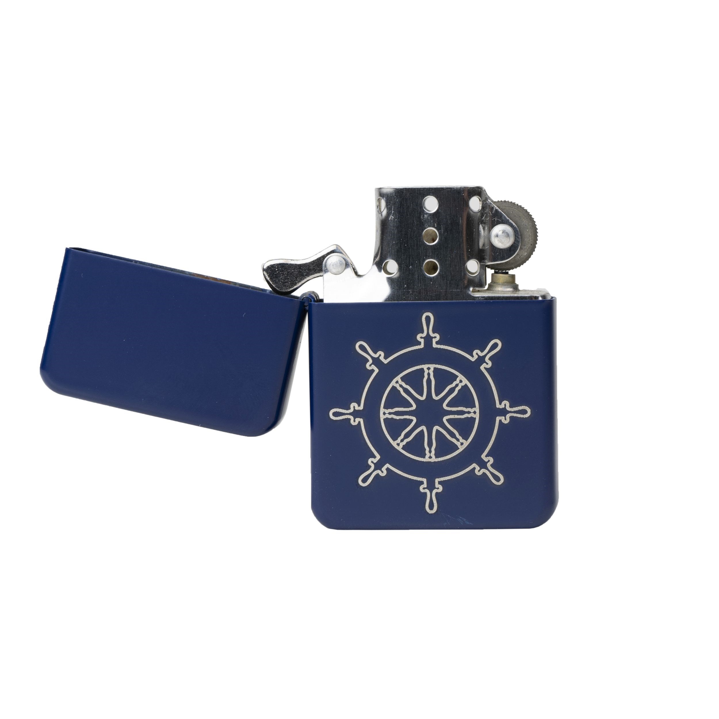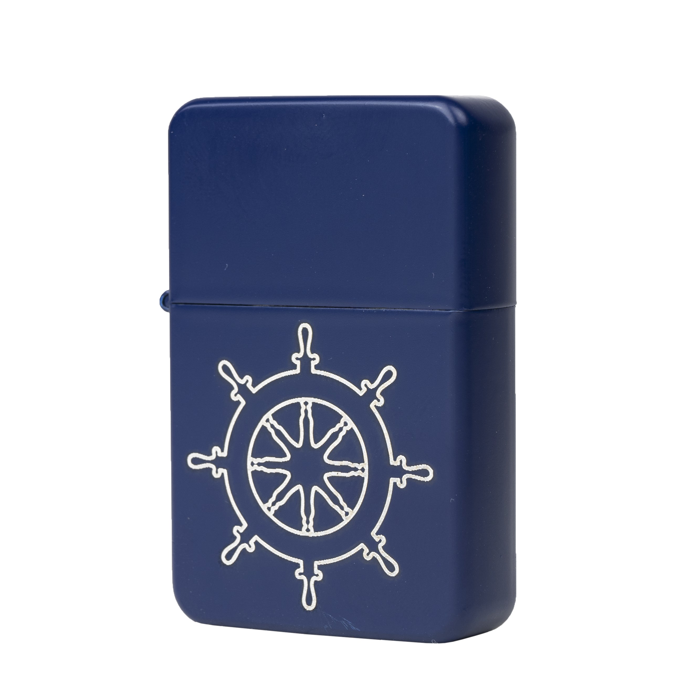 Briquet bleu mat avec un gouvernail gravé au centre. Finition de qualité, l'image ne s'efface pas facilement. Face arrière sans image. À essence (essence non fournie).