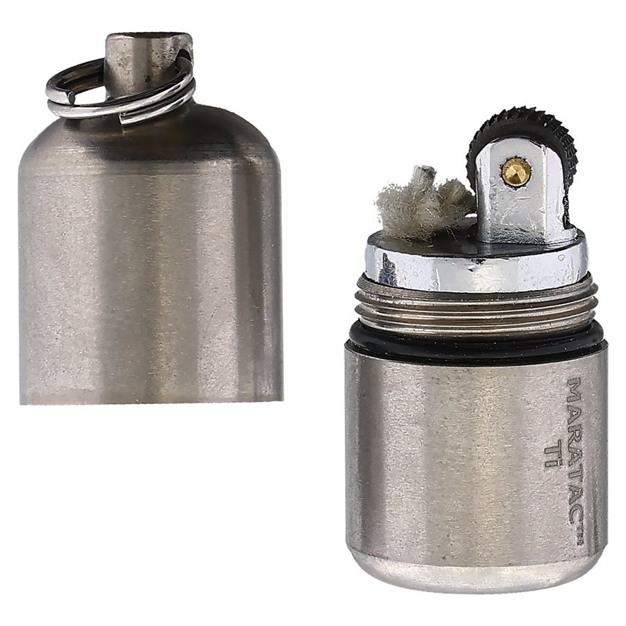 Briquet rangé dans un étui étanche en titane. Petit, léger, résistant, fiable. Dimensions : environ 3,3 x 1,3 cm. Plus d'informations