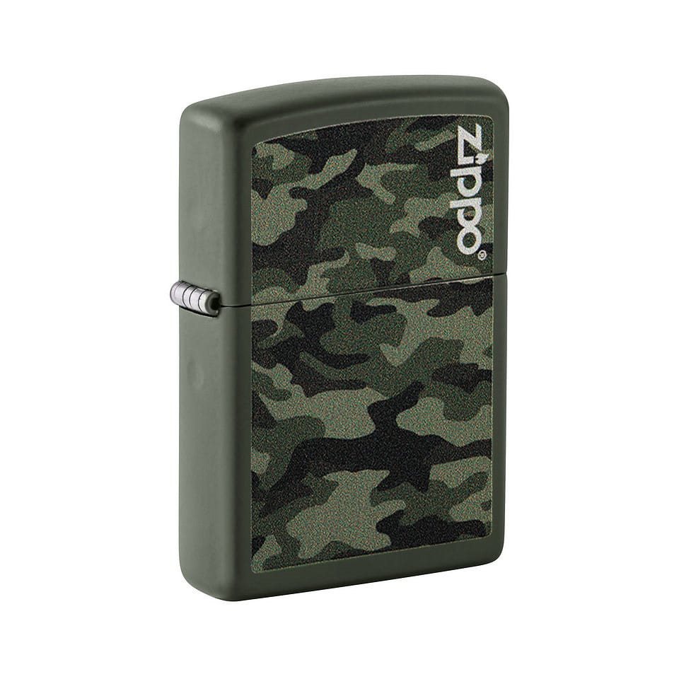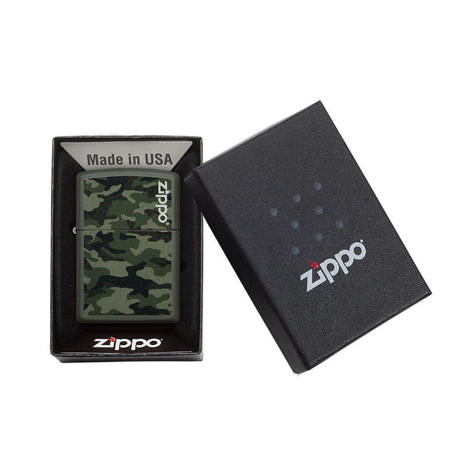 Briquet à essence ZIPPO classique au design camouflage, présenté dans un coffret cadeau. Il est fabriqué en métal résistant et sa flamme résiste au vent.
