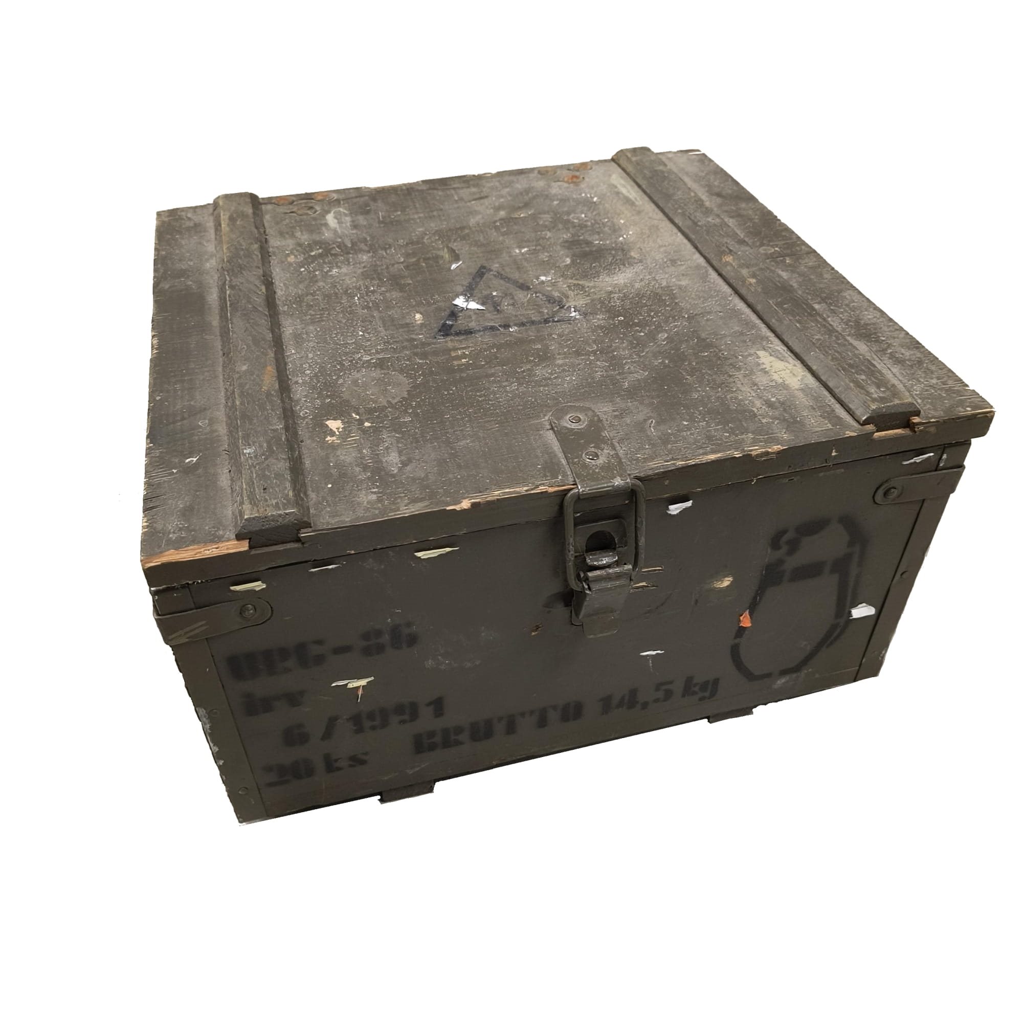 Caisse en bois d'occasion avec couvercle, provenant des grenades URG-86. Dimensions intérieures : 31,5 x 27,5 x hauteur 15 cm. Plus d'informations