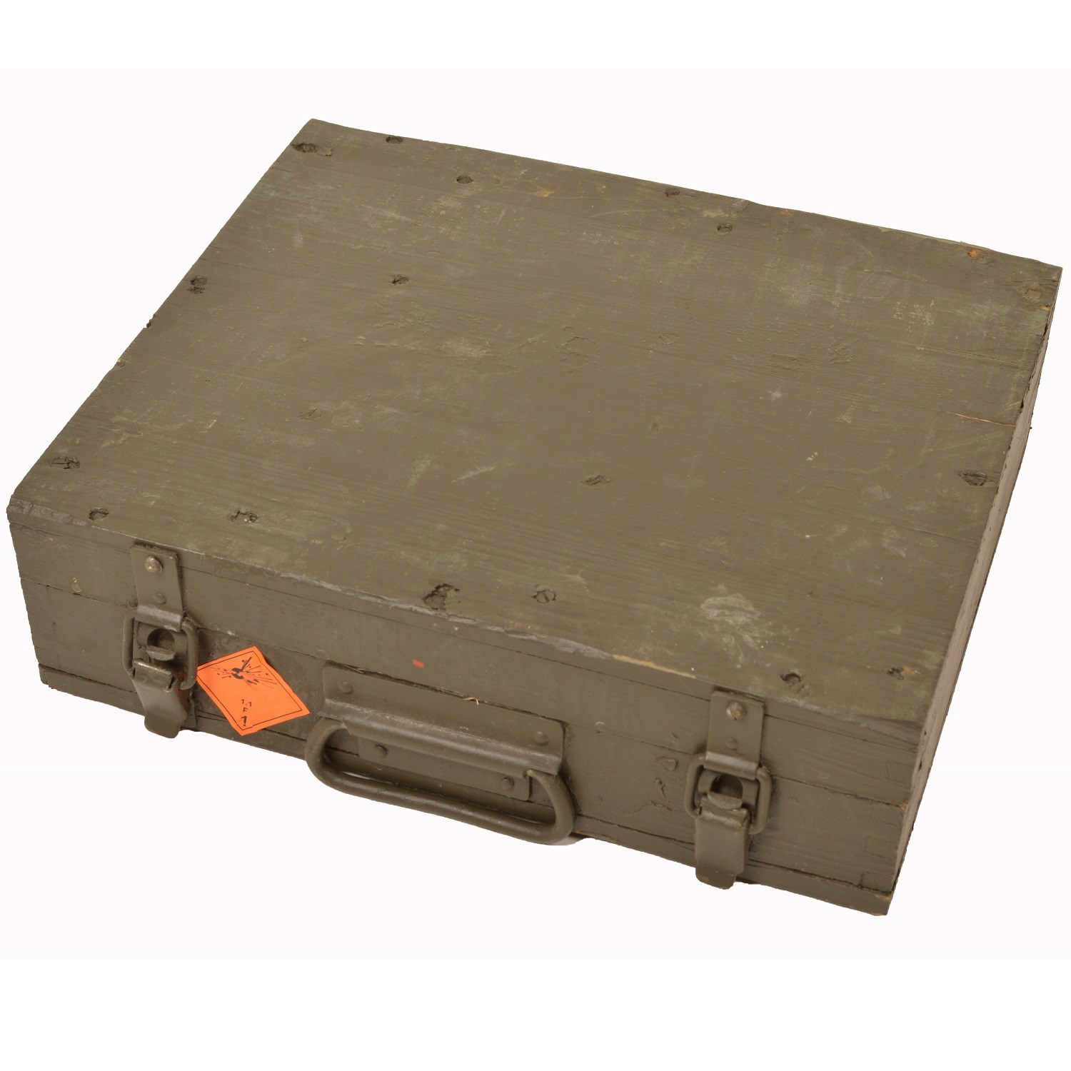 Caisse en bois d'occasion avec couvercle, pour munitions 82-EO-M. Dimensions : 39 x 32 x 11 cm. Plus d'informations