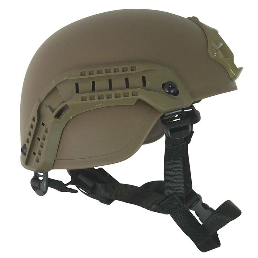 Réplique du casque balistique américain ACH/MICH, également connu sous le nom de TC 2000. Les coussinets rembourrés amovibles permettent de porter le casque avec des écouteurs de tir classiques. Le montage avant est destiné à la fixation d'un appareil de vision nocturne, les rails latéraux servent à fixer des accessoires compatibles (lampe, écouteurs, etc.).