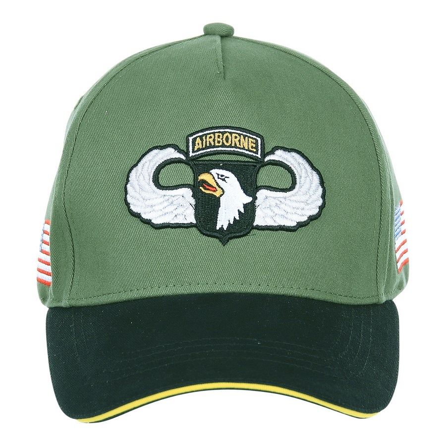 Casquette avec broderie de la 101e division aéroportée américaine. Emblème brodé représentant une poule et des ailes. Taille universelle ajustable à l'aide d'une bande.