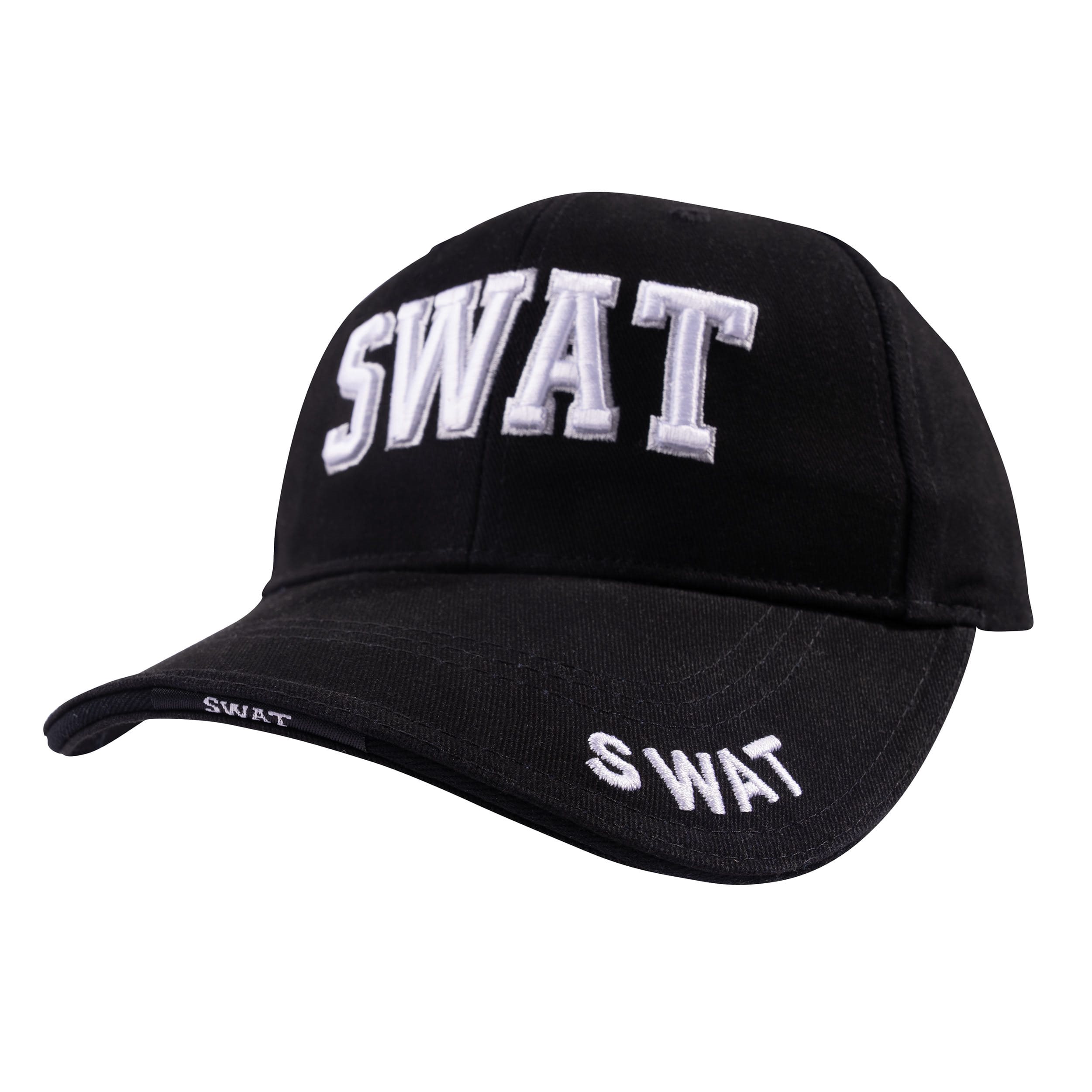 Casquette noire confortable à profil bas avec inscription SWAT brodée en blanc. Bandeau anti-transpiration souple. Taille ajustable à l'aide d'une bande. Plus d'informations