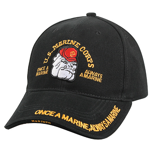 Casquette confortable à profil bas en coton peigné. Couleur noire avec motif U.S. MARINE CORPS BULDOG. Visière superposée avec broderie ONCE A MARINE, ALWAYS A MARINE / une fois marine, toujours marine /. Boucle velcro avec broderie US.MARINE. Plus d'informations