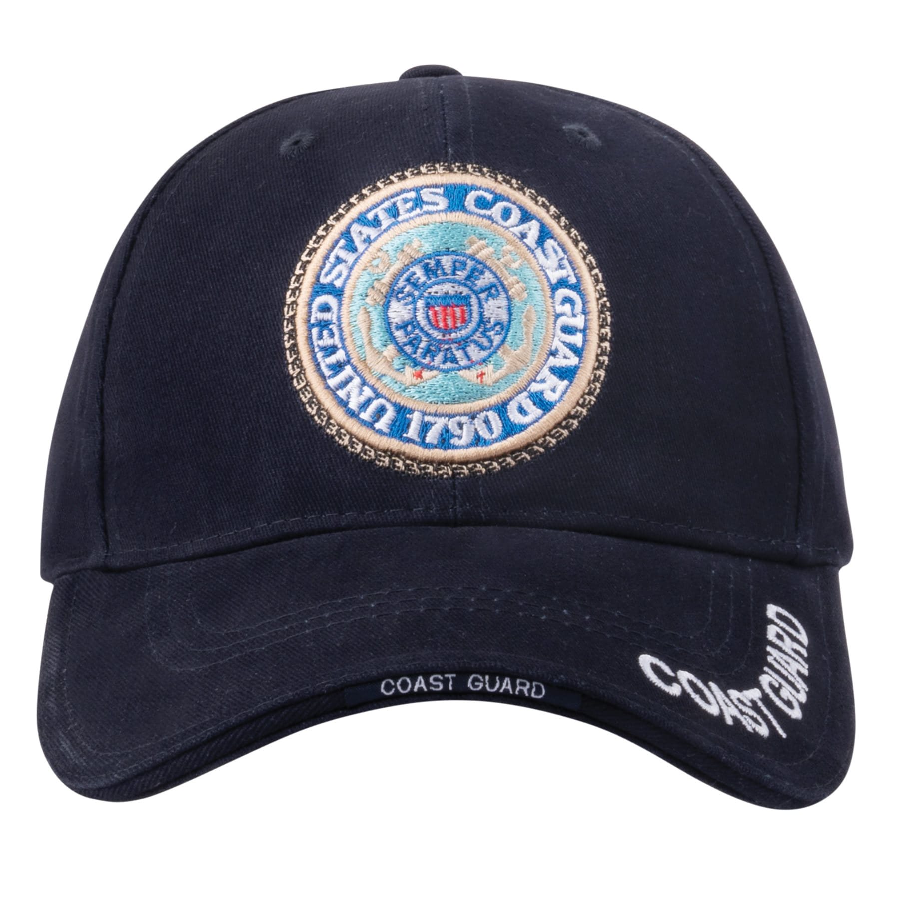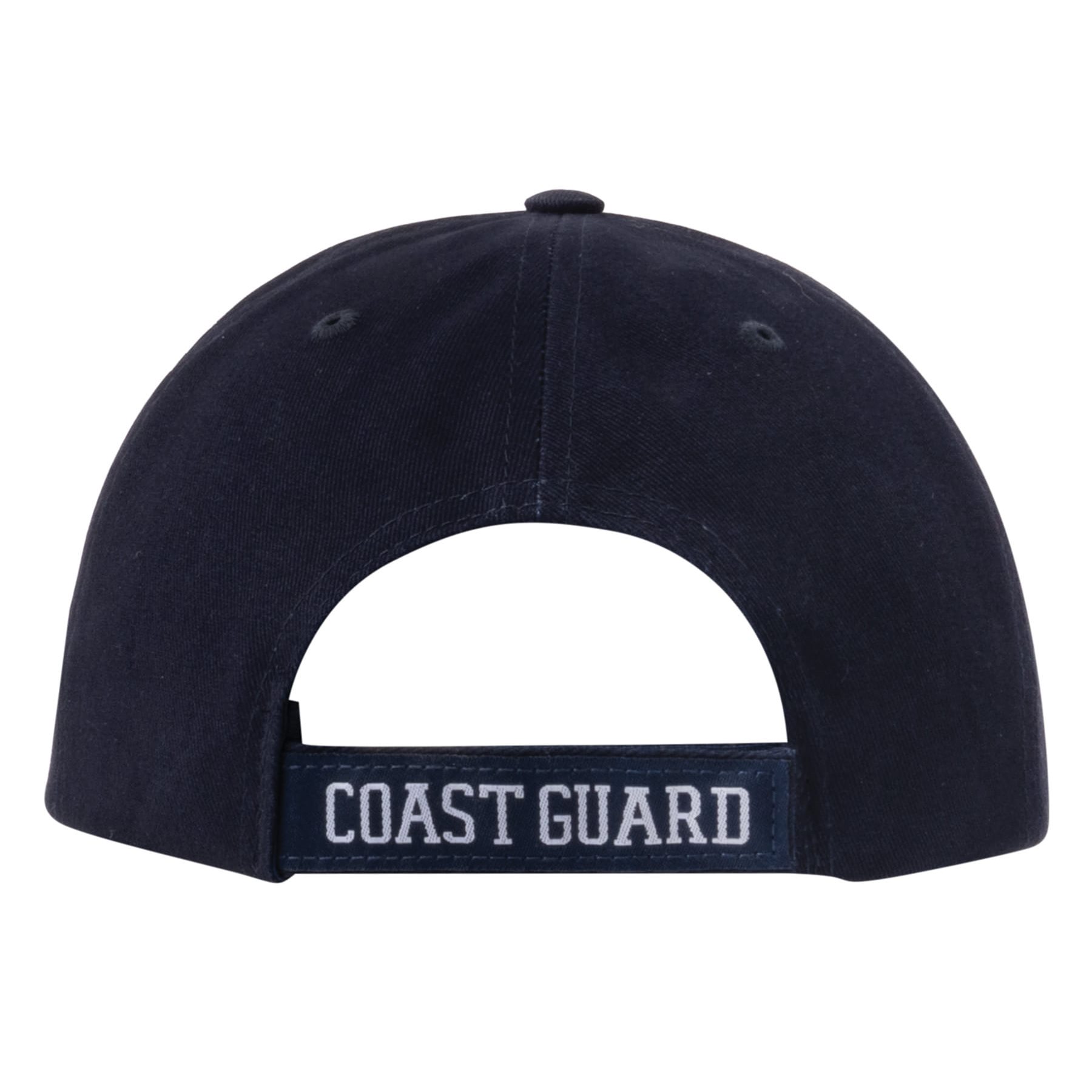 Casquette à visière basse avec logo 3D brodé en relief et inscription « US Coast Guard » (garde-côtes américains). Plus d'informations