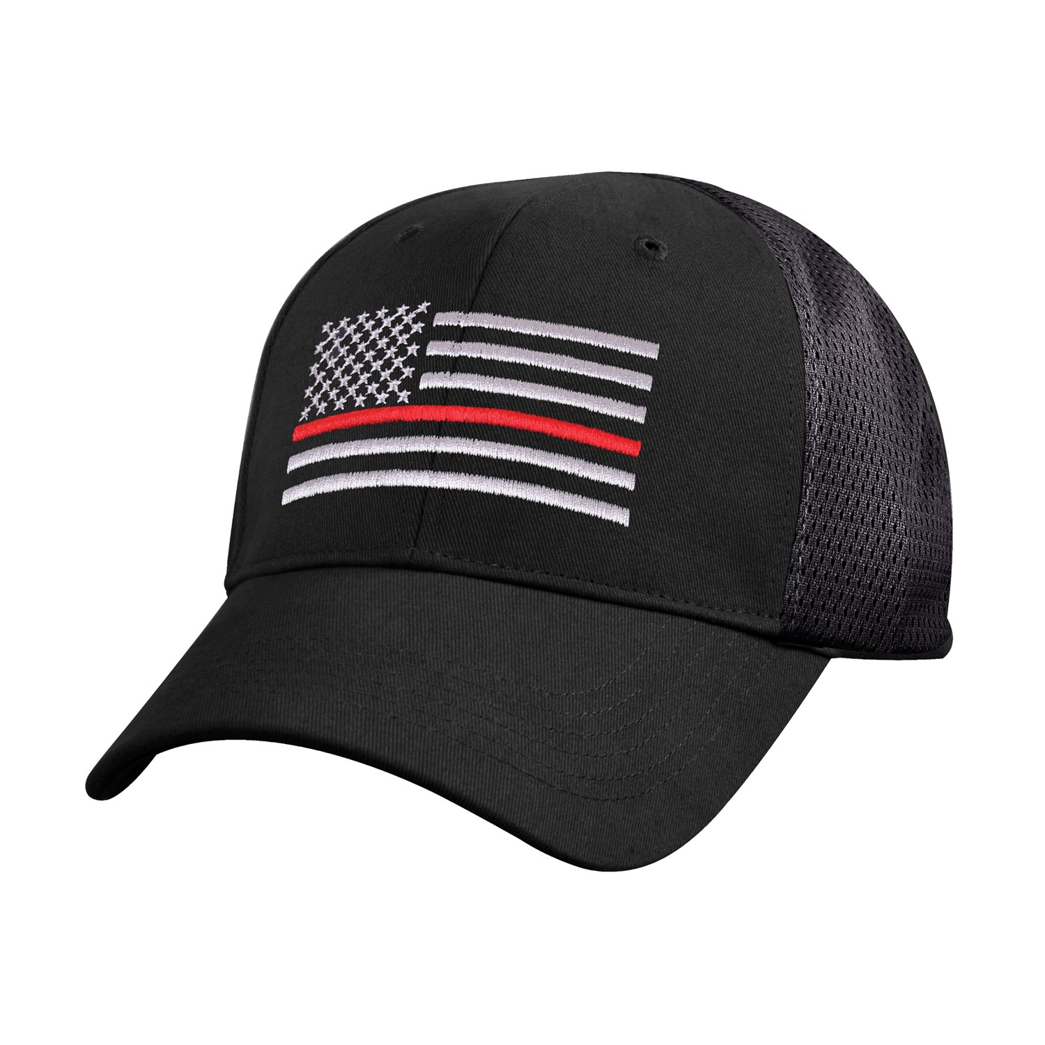 Casquette à visière plate partiellement en maille avec drapeau américain brodé.