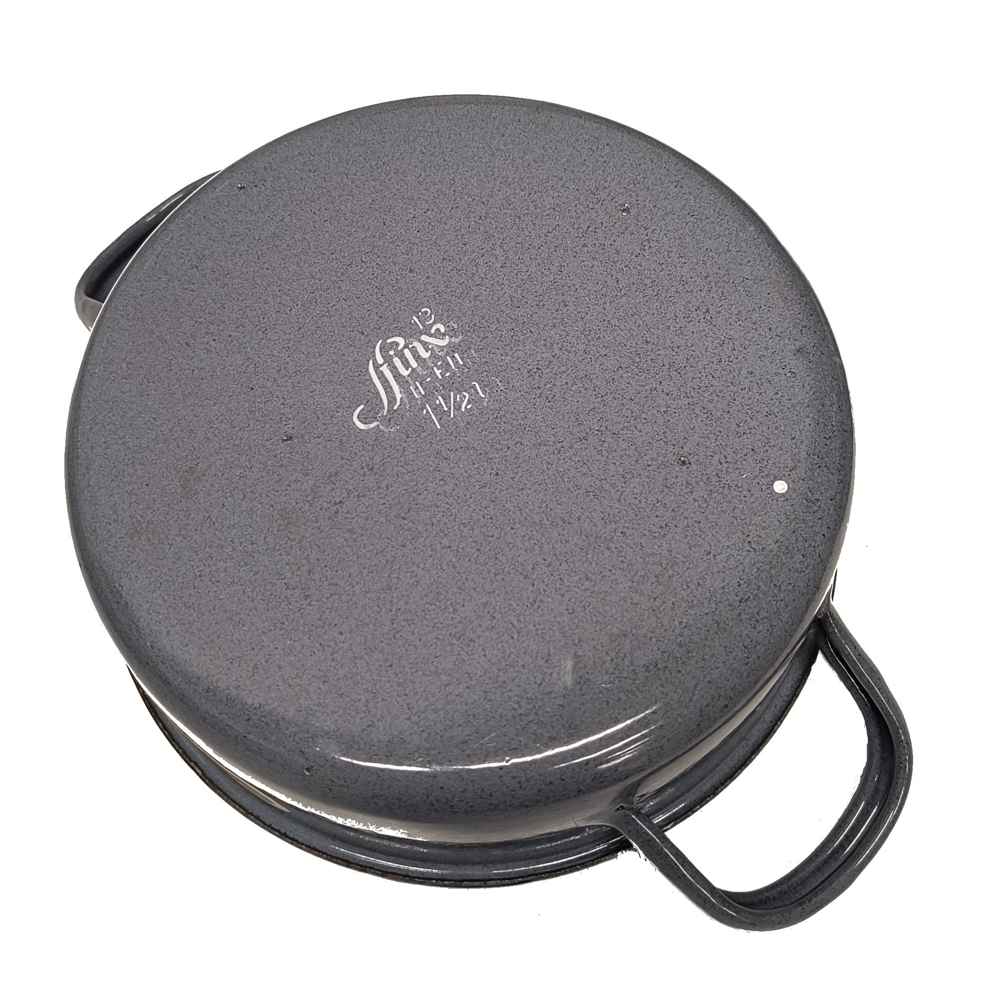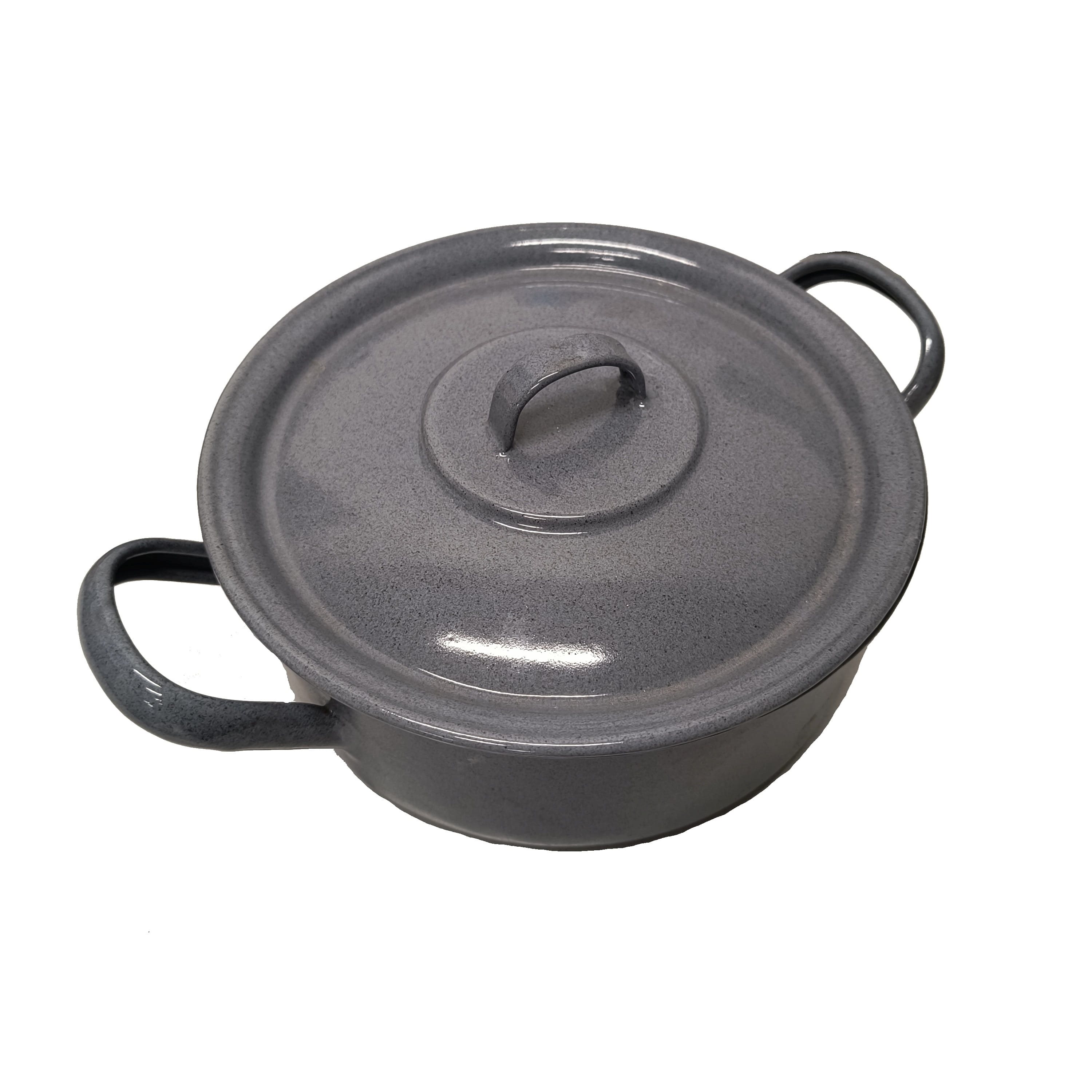 Casserole émaillée basse avec poignées, d'un diamètre de 13 cm, et couvercle.