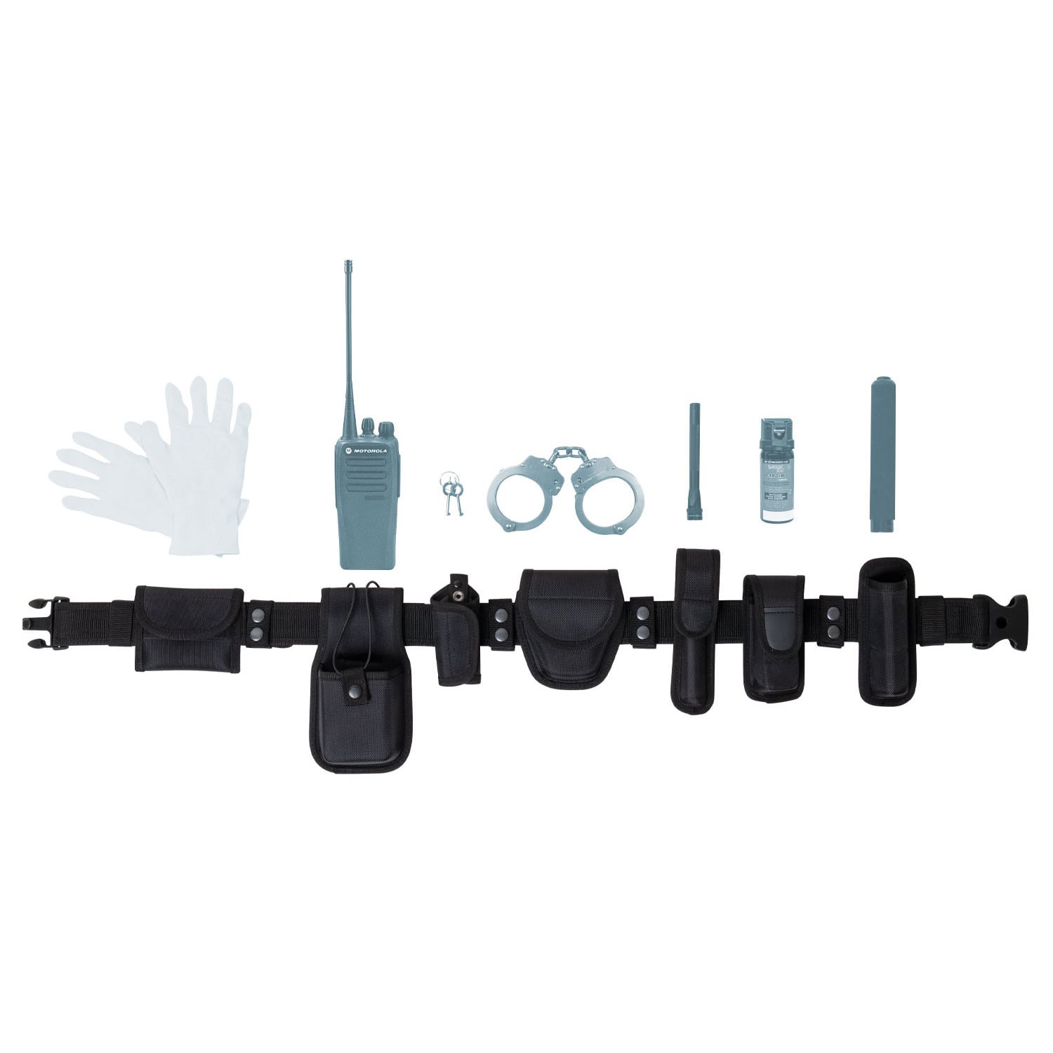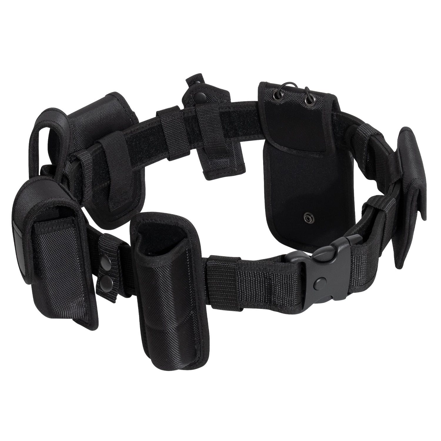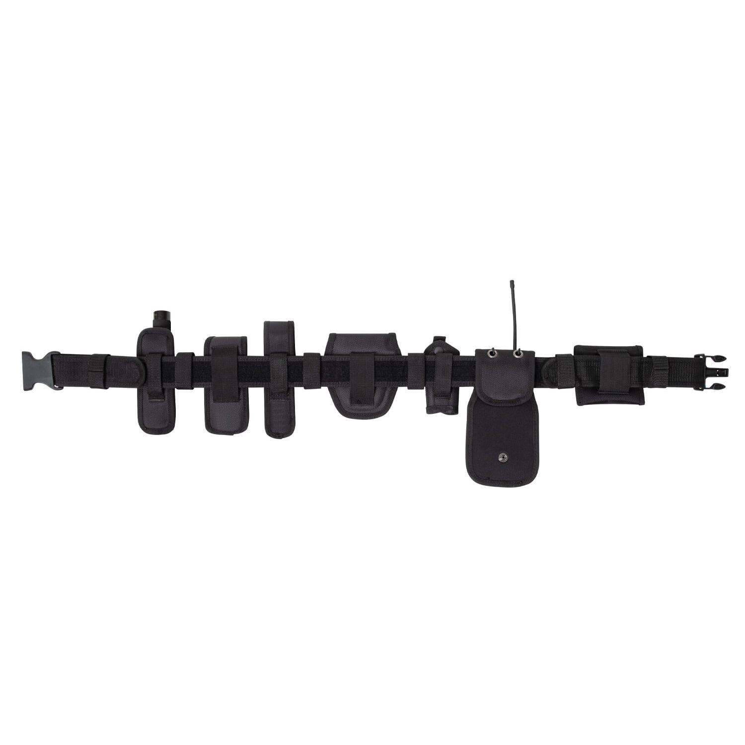 Ensemble comprenant une ceinture de service et plusieurs étuis compatibles. La ceinture est fabriquée en polyester résistant, mesure 5,5 cm de large et se ferme à l'aide d'une boucle en plastique robuste. Les accessoires et étuis inclus dans l'ensemble sont fabriqués en polyester balistique, un matériau caractérisé par sa grande résistance.