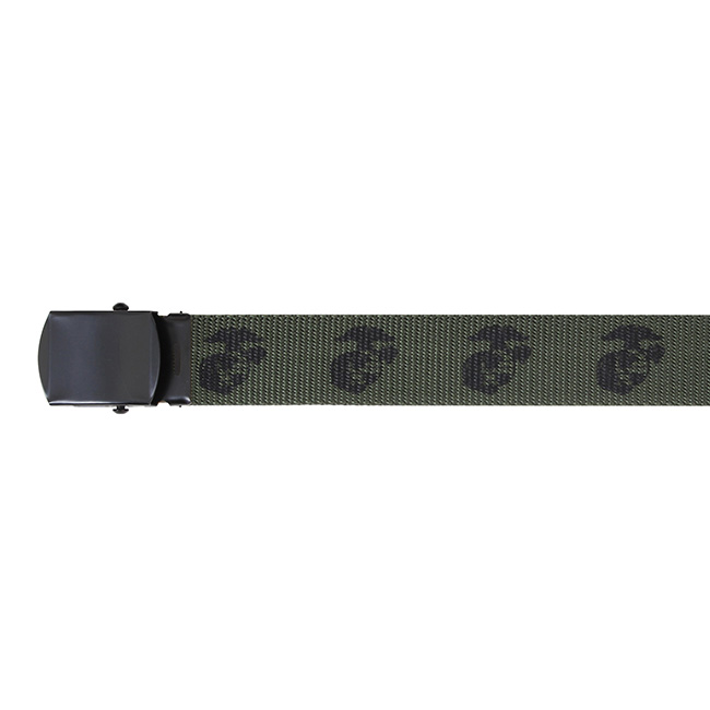 Ceinture verte avec impression noire du logo des Marines américains (USMC), boucle noire. Matériau : polyester, longueur 135 cm, largeur 3 cm.