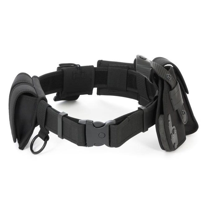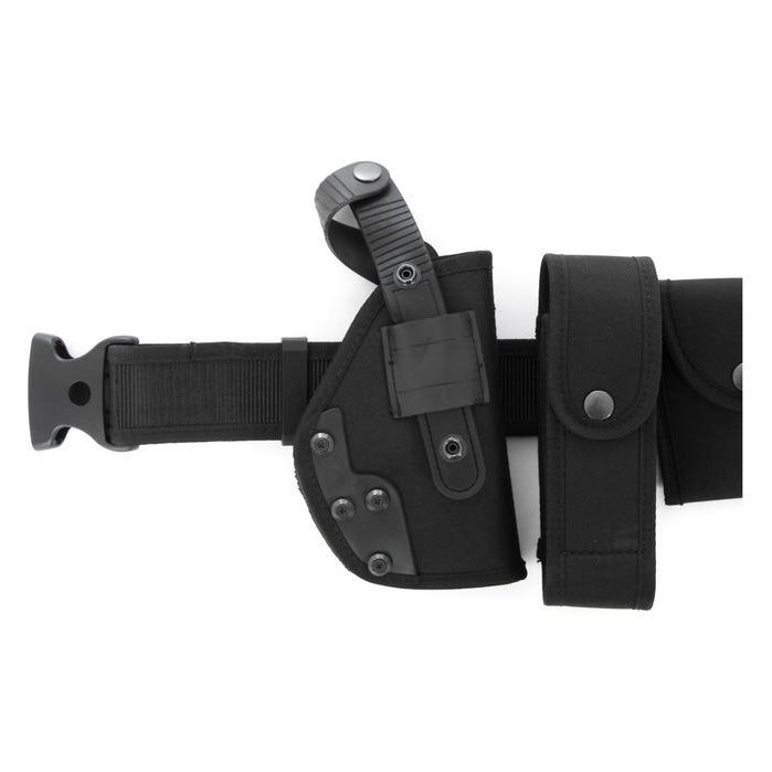 Ceinture tactique robuste dotée d'une boucle en plastique solide avec dispositif de sécurité. Elle est livrée avec un étui pour pistolet, une pochette double pour chargeurs de pistolet, trois étuis universels à pression, une pochette élastique pour petits objets et un anneau métallique solide pour accrocher du matériel. La taille de la ceinture est réglable à l'aide d'une bande Velcro.