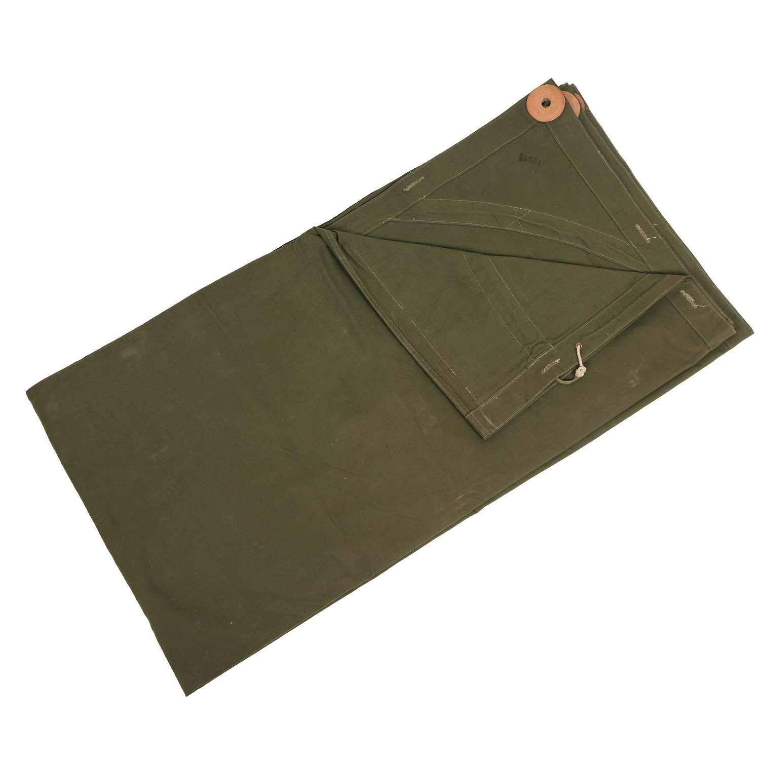 Bâche tchèque d'origine. Cette bâche peut être utilisée pour construire un abri d'urgence, deux bâches permettent de construire une tente en forme de A et, enfin, elle peut également servir de cape. La bâche a été utilisée, mais ne présente que des signes d'usure légers. Dimensions : environ 180 x 180 cm.