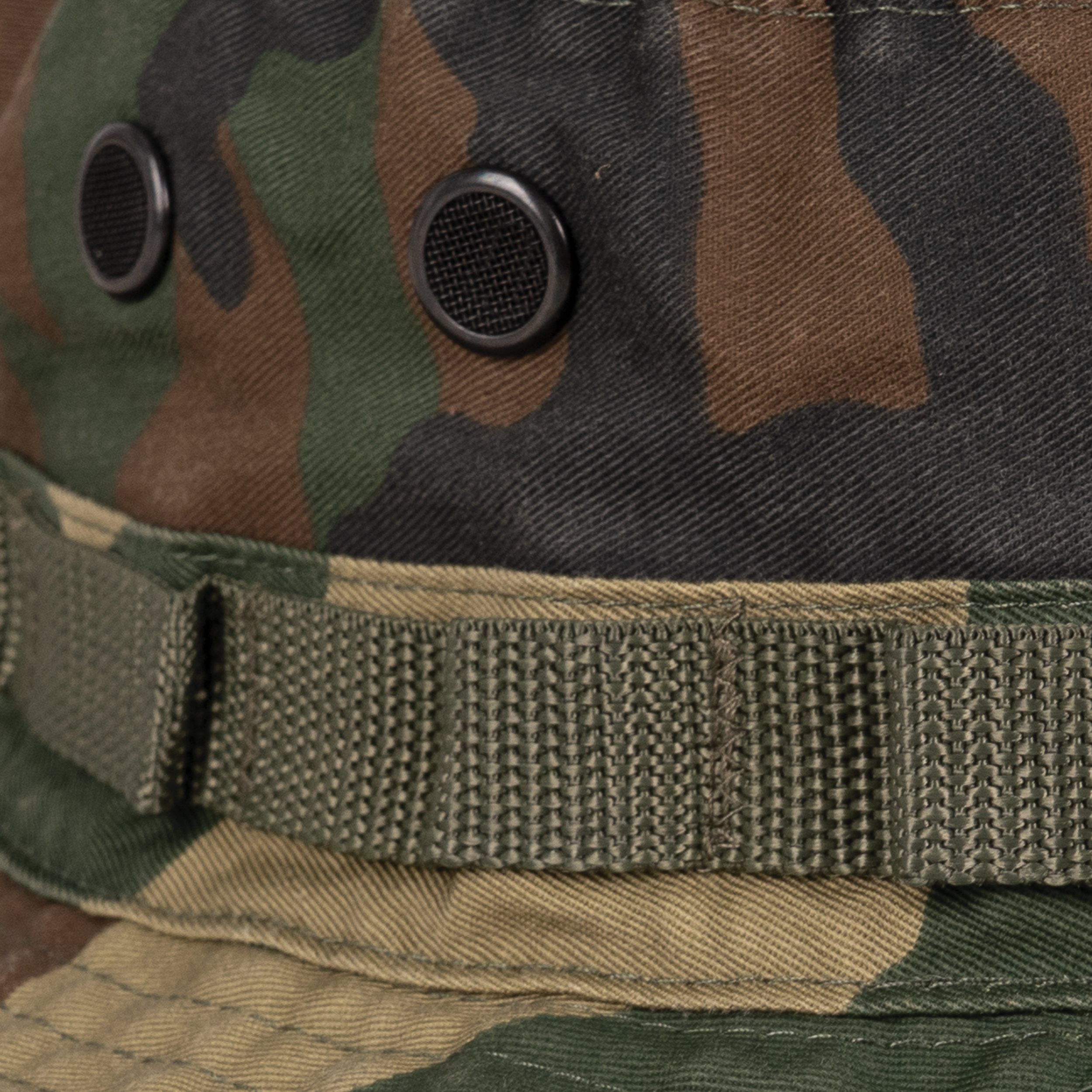 Ce chapeau Boonie de la société Rothco présente un design vintage. Il est doté de quatre ouvertures d'aération (avec grille), d'un cordon sous le cou avec un arrêt en cuir et de boucles sur le pourtour du chapeau pour fixer un camouflage supplémentaire (appelé foliage ring).