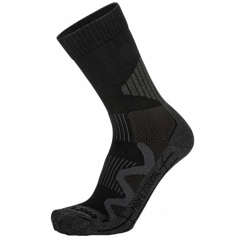 Chaussette hautement technique à coupe anatomique (gauche/droite) développée pour un usage militaire et pour les services de garde. Elle offre un confort optimal grâce à son rembourrage au niveau du talon d'Achille et du cou-de-pied et à son bord supérieur confortable. Une grande respirabilité et un confort climatique sont garantis. La chaussette s'ajuste parfaitement grâce à sa construction bi-élastique sans coutures et à la composition de ses matériaux.