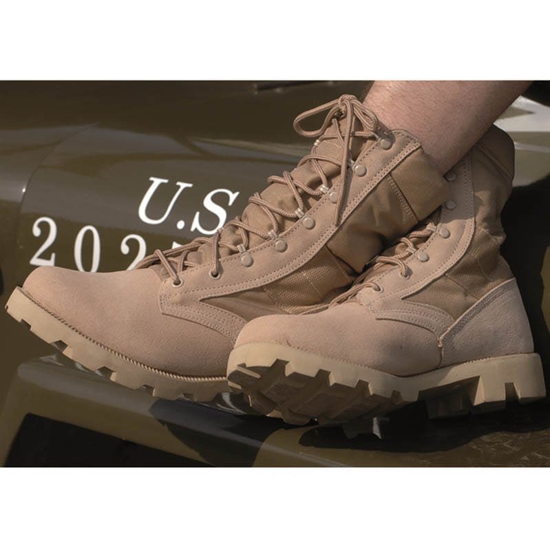 réplique des chaussures légendaires des forces armées américaines, dans une version désert (kaki). Renforcées avec du Cordura, un matériau résistant à des charges plus importantes. Plus d'informations