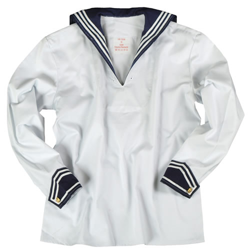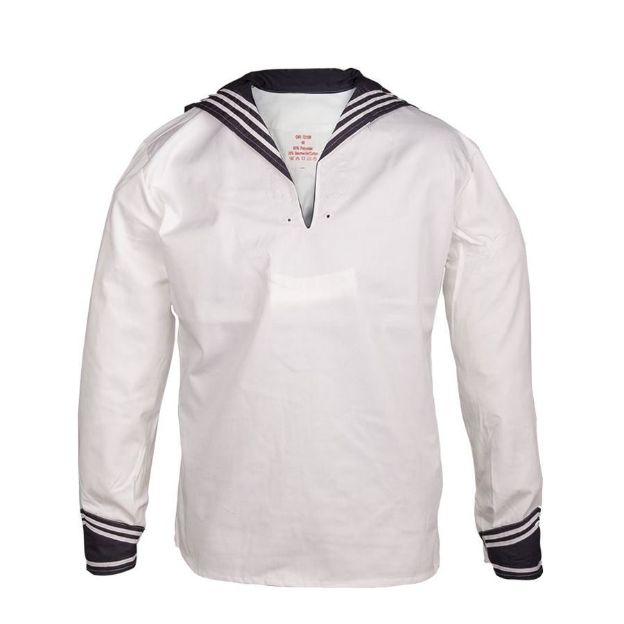 Chemise marine BW blanche à grand col. Poignets et col de couleur bleue. Poignets fermés par des boutons dorés avec motif d'ancre. Composition : 100 % coton. Plus d'informations