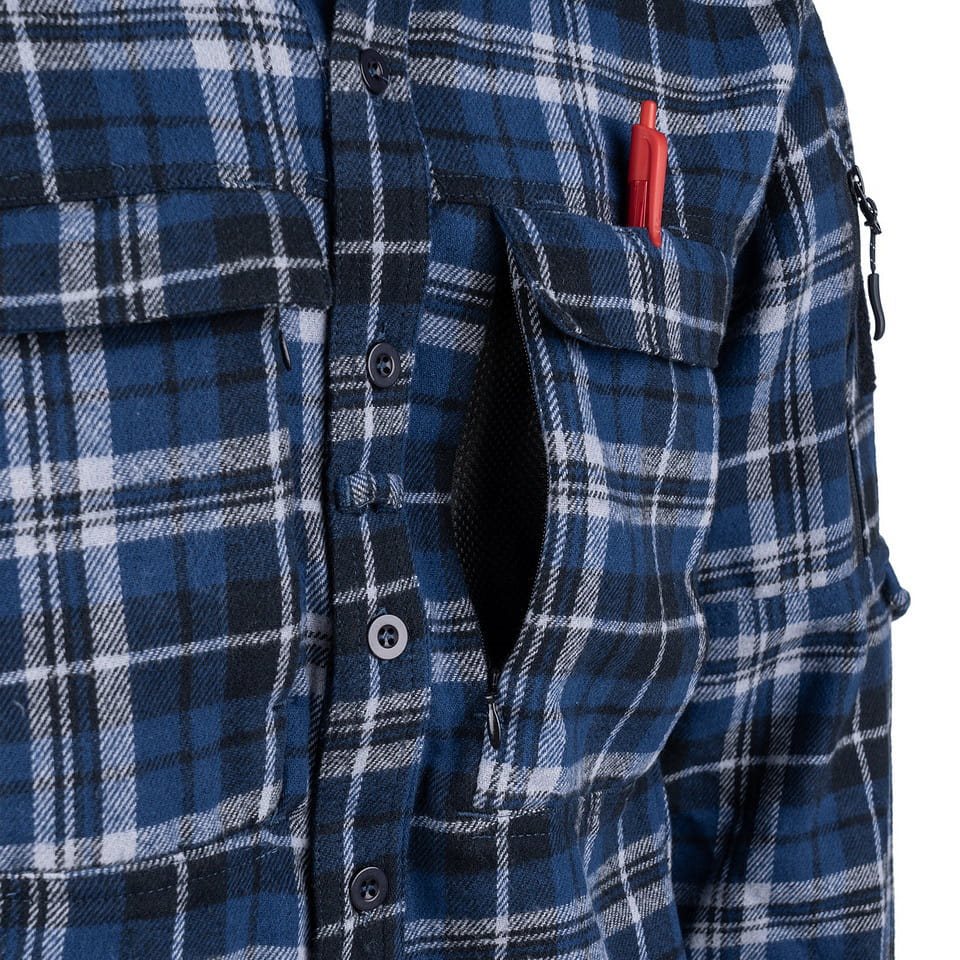 La chemise se ferme à l'aide de boutons résistants. Sur la poitrine, vous trouverez des poches profondes fermées par des rabats à velcro. Sous ces poches, vous trouverez deux autres poches cachées. Elles sont accessibles par des fermetures éclair verticales, peuvent facilement contenir un smartphone de n'importe quelle taille et sont doublées d'une fine maille. Les deux manches sont dotées de grands panneaux à velcro destinés à vos écussons VELCRO. Sous les panneaux se trouvent des poches à fermeture éclair dans lesquelles sont rangés des boutons-pression. Vous pouvez les utiliser pour fixer les manches retroussées. Si vous portez souvent des lunettes, vous apprécierez certainement l'œillet simple qui sert à les accrocher.