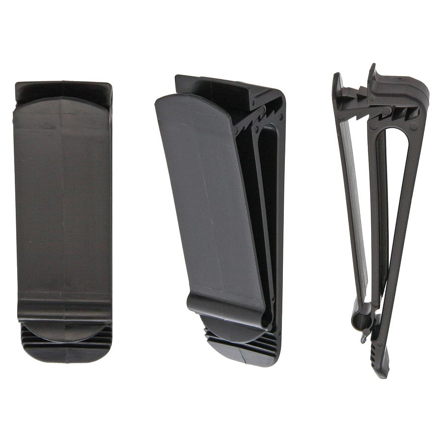 Clip en plastique conçu pour être fixé à une ceinture ou à une sangle plus large. Dispose de trois dents pour empêcher l'ouverture accidentelle. Convient aux ceintures/sangles d'une largeur maximale de 4 cm. Matériau : plastique rigide. Longueur totale : environ 6 cm, largeur : environ 1,9 cm.