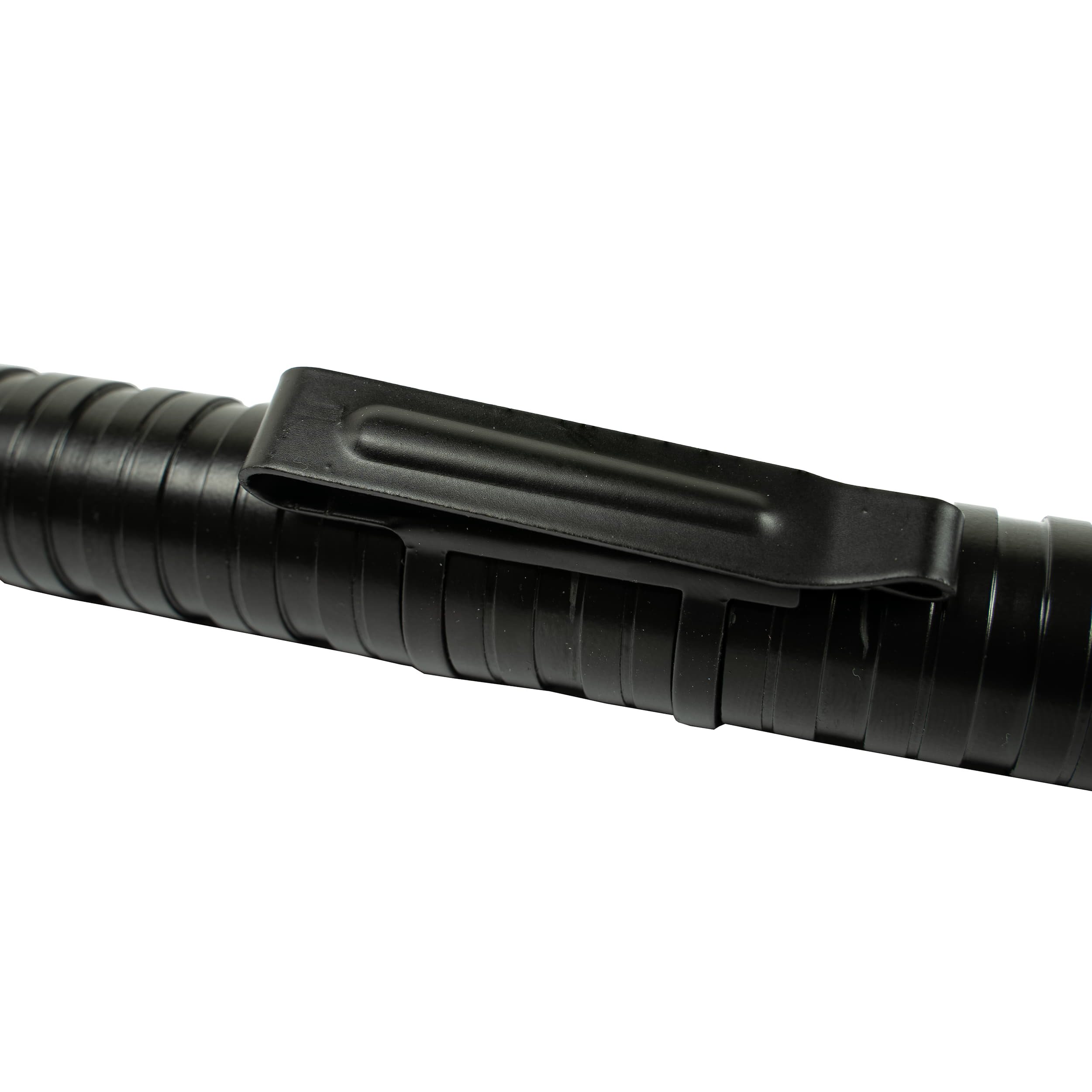 Ce clip métallique s'attache facilement au bâton télescopique compact et permet ainsi de le porter de manière dissimulée à la ceinture, à l'intérieur ou à l'extérieur du pantalon, ou encore sur un gilet tactique.