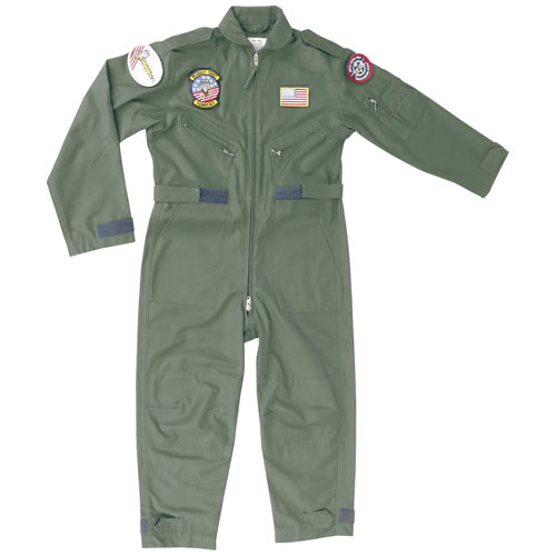 Combinaison de pilote pour enfant. Bandes velcro pour ajuster la taille, fermeture à glissière, écussons amovibles, genoux renforcés.