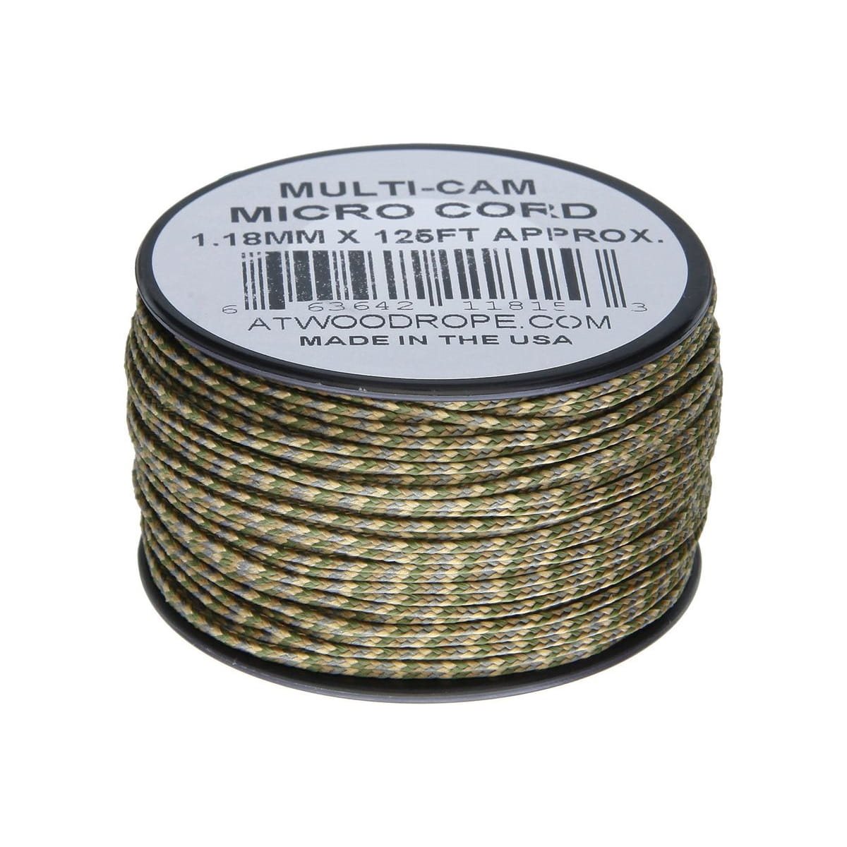 Cordon micro paracord de haute qualité, fabriqué aux États-Unis par le célèbre fabricant ATWOOD ROPE. Le cœur est composé de plusieurs brins d'un diamètre total de 1,18 mm. Longueur totale d'environ 38 m - enroulé sur une bobine en plastique. Matériau : nylon.