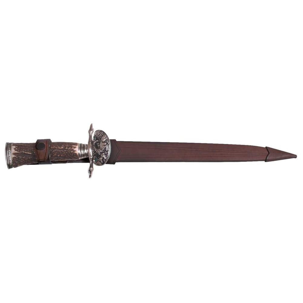 Le poignard de chasse KING sert de sabre d'initiation pour les nouveaux membres des associations de chasseurs. Il est fabriqué en acier inoxydable de haute qualité de type 420 avec une dureté de 52-55 HRc. Le manche du poignard KING est en bois de cerf véritable et présente une forme ergonomique. La garde et la monture arrière sont richement décorées. Le poignard est livré en standard avec un étui en cuir.