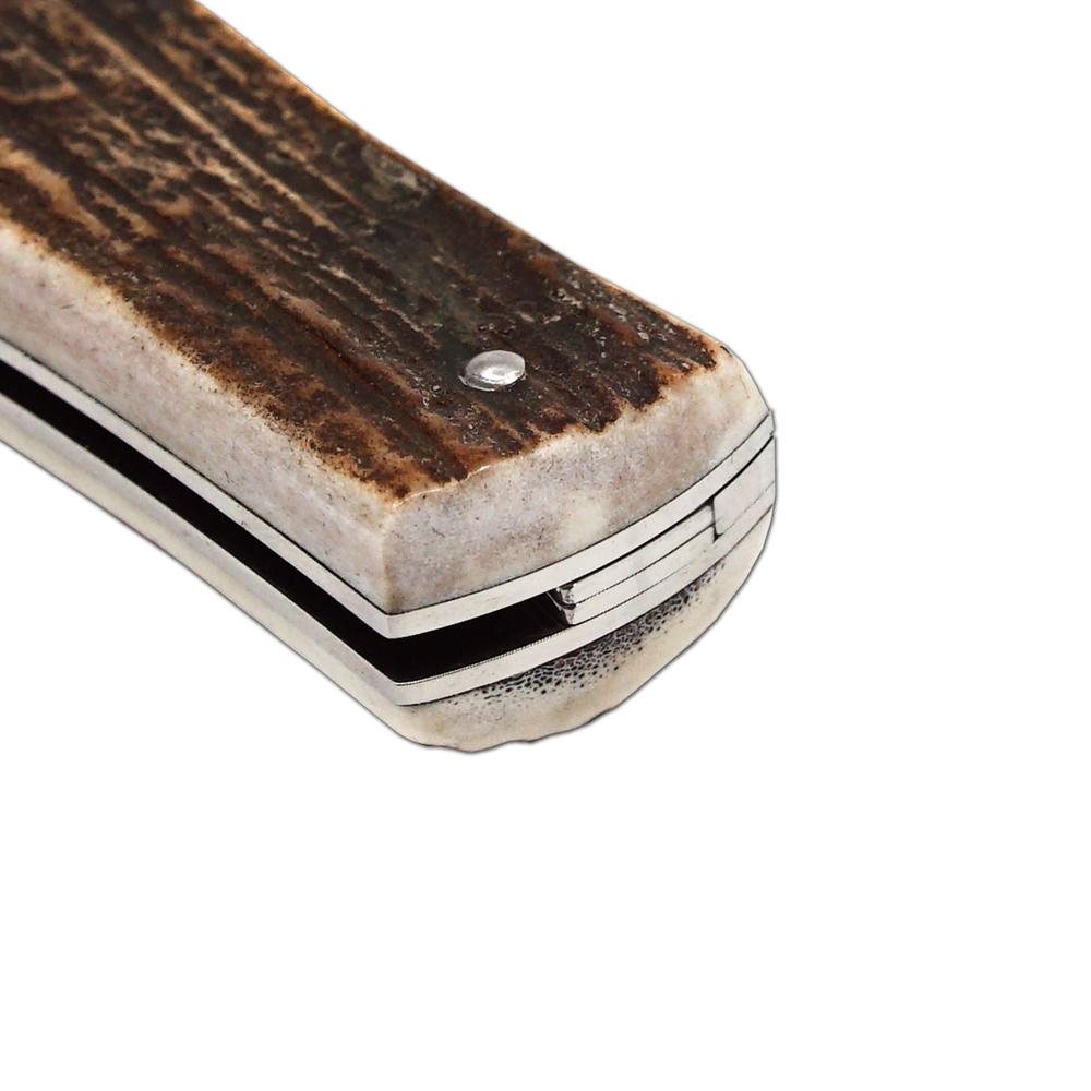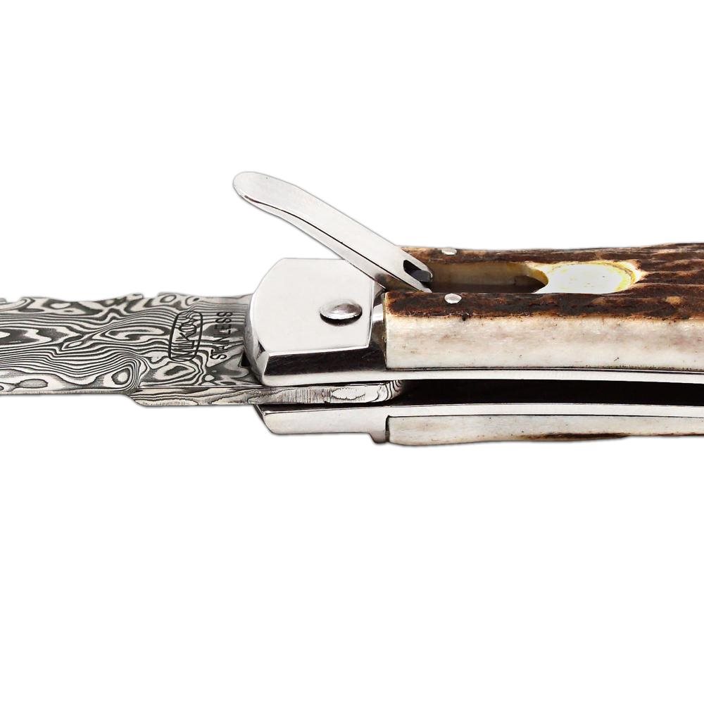 Matériau de la lame : PMC 27 - Acier damassé Matériau du manche : bois de cerf Longueur du produit : 120 mm Longueur de la lame : 95 mm Largeur de la lame : 23 mm Étui : étui en cuir inclus Plus d'informations