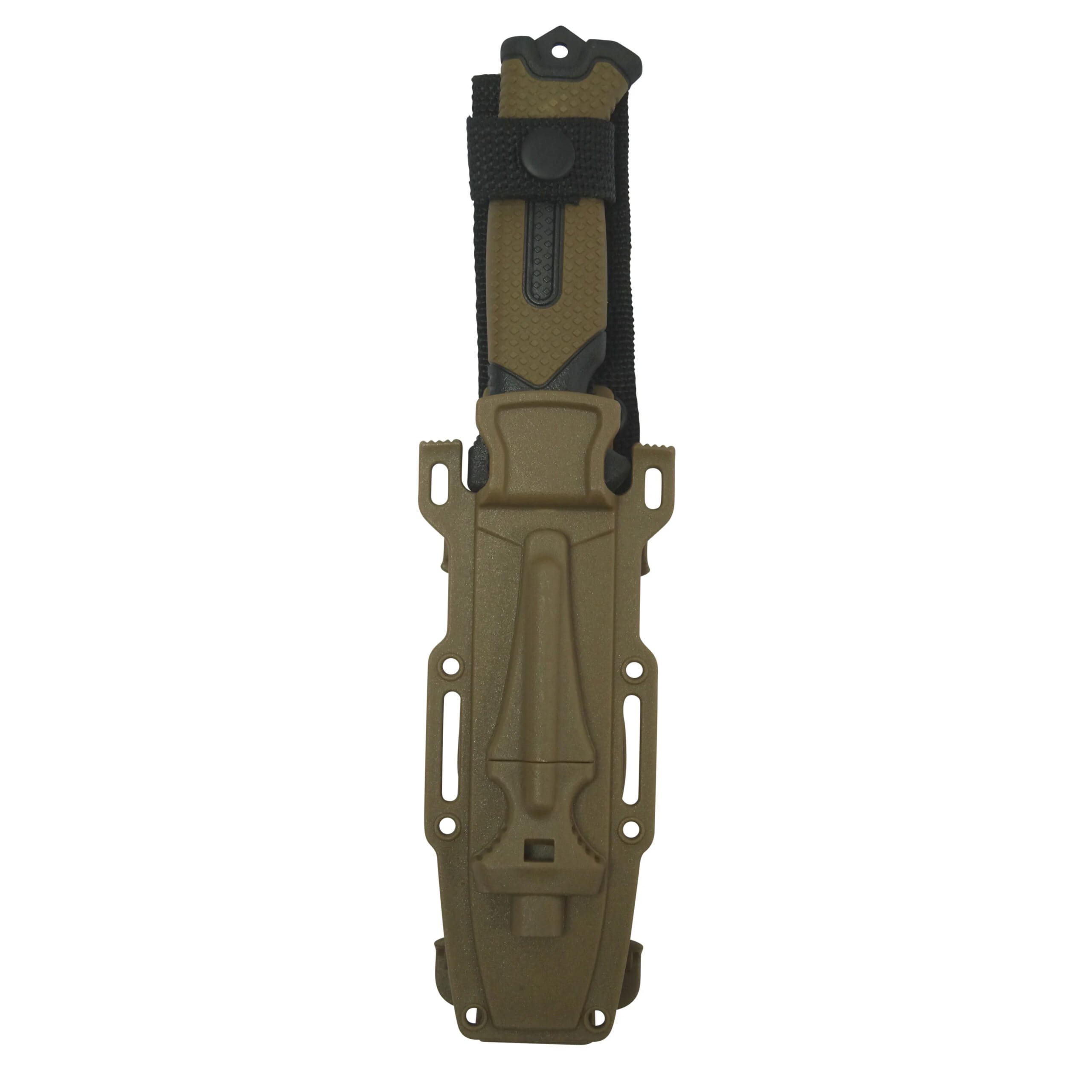 Couteau outdoor à lame fixe et étui en plastique avec silex et sifflet intégrés. La lame noire à tranchant lisse est en acier inoxydable et dispose d'une scie dans sa partie supérieure. Le manche en caoutchouc est doté d'une texture antidérapante et texturée pour offrir une prise en main optimale dans toutes les situations. À l'extrémité du manche, vous trouverez une protubérance pouvant être utilisée pour briser une vitre en cas d'urgence et un trou pour passer un cordon de sécurité. Le couteau est livré avec un étui en plastique ABS qui peut être fixé horizontalement à l'équipement si nécessaire.